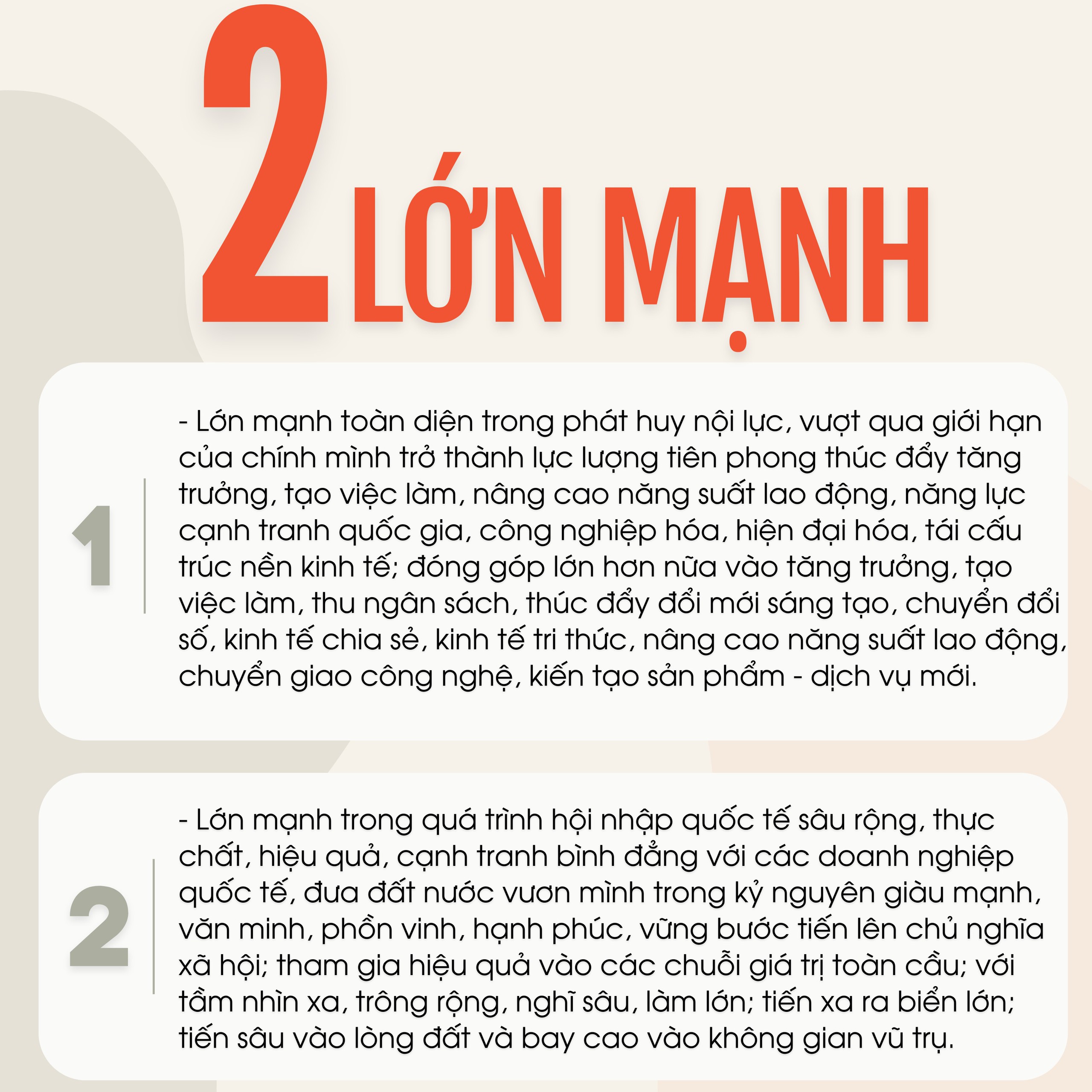 Như vậy, 2 yêu cầu lớn mạnh - một về nội lực, một về hội nhập - là 3 trụ cột song hành giúp doanh nghiệp Việt vươn lên vững vàng. Và nhìn rộng hơn, khi đặt cạnh nhau, " 3 tiên phong" và "2 lớn mạnh" chính là bản thiết kế hành động của khu vực kinh tế tư nhân - và rộng hơn, của cả nền kinh tế trong kỷ nguyên mới.