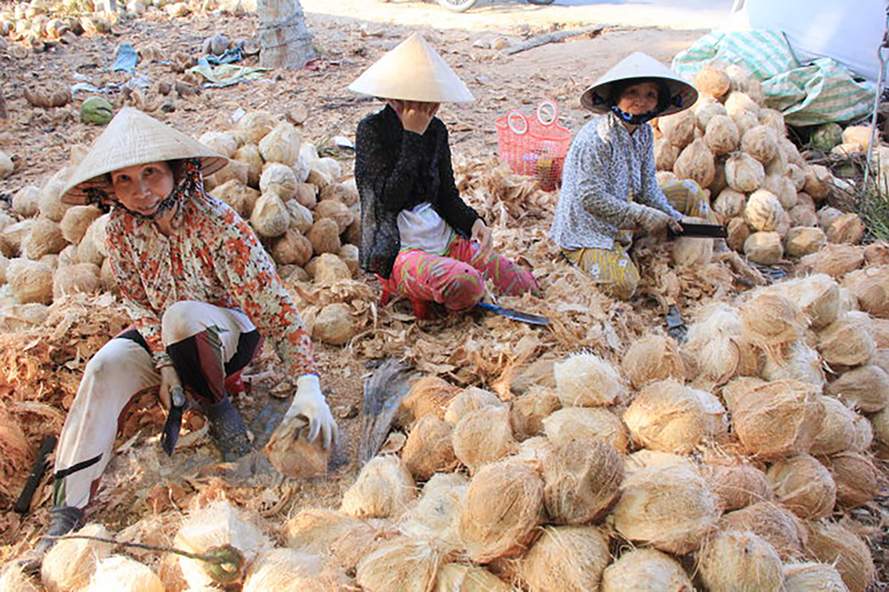 Sơ chế dừa tại xã Đa Phước Hội, huyện Mỏ Cày Nam. Ảnh: báo Đồng Khởi