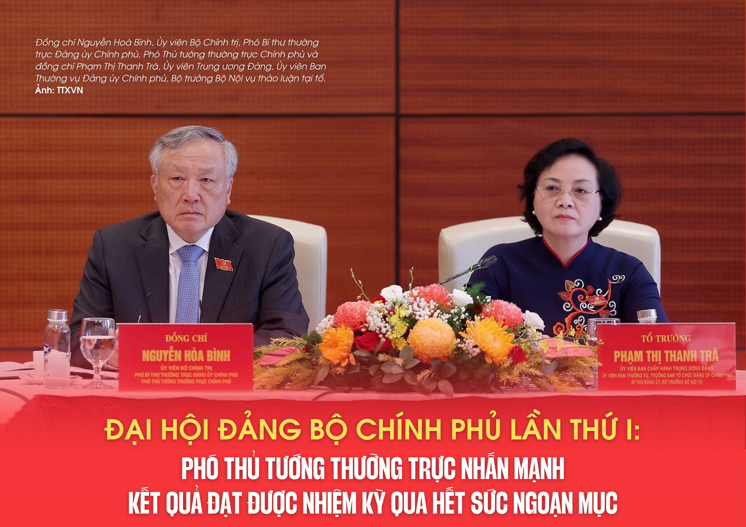 Đồng chí Nguyễn Hoà Bình, Ủy viên Bộ Chính trị, Phó Bí thư thường trực Đảng ủy Chính phủ, Phó Thủ tướng thường trực Chính phủ và đồng chí Phạm Thị Thanh Trà, Ủy viên Trung ương Đảng, Ủy viên Ban Thường vụ Đảng ủy Chính phủ, Bộ trưởng Bộ Nội vụ thảo luận tại tổ