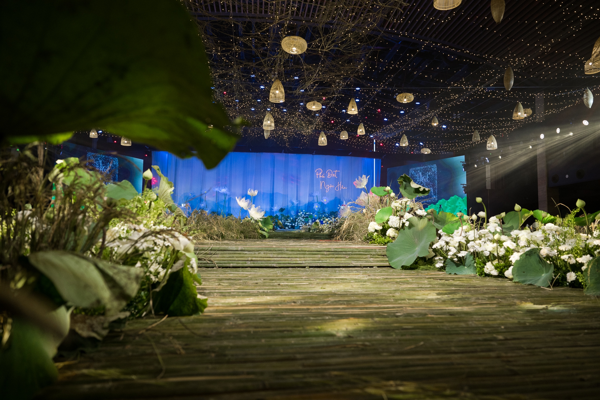 Những bông hoa sen, lúa nước được sắp xếp khéo léo, tự nhiên như một bức tranh làng quê sinh động. Cây cầu tre nhỏ được cách điệu mềm mại để thành lối dẫn đưa cô dâu chú rể bước những bước đi đầu tiên trên con đường hôn nhân. Lối dẫn được làm 100% từ tre tự nhiên.