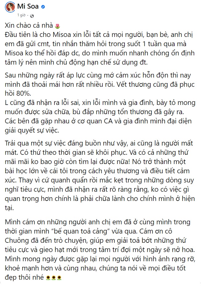 Ngoài gửi lời cảm ơn tới sự quan tâm của mọi người xung quanh, Misoa Kim Anh cho biết phía bạn trai đã gặp cô để xin lỗi. Cô cũng muốn mọi việc dừng lại tại đây.