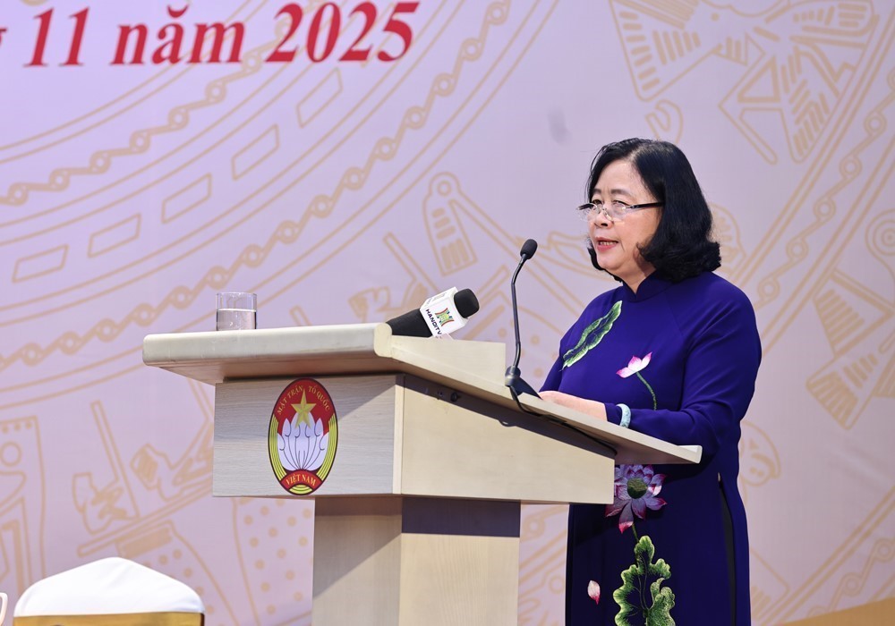 Đồng chí Bùi Thị Minh Hoài, Chủ tịch Ủy ban Trung ương MTTQ Việt Nam phát biểu. Ảnh: Minh Đức – TTXVN