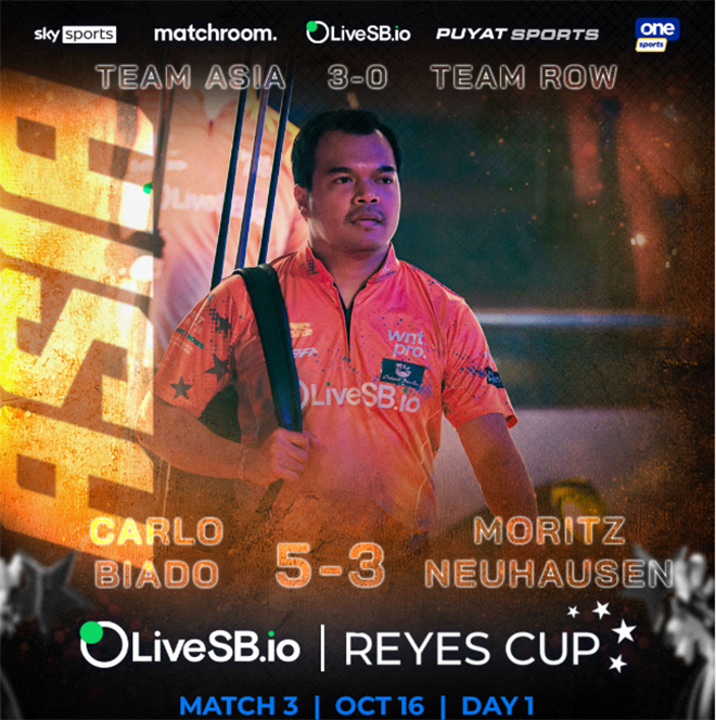 Mở màn cho chuỗi chiến thắng là Carlo Biado, đương kim vô địch thế giới. Anh tận dụng sai lầm của Francisco Sanchez Ruiz ở bi số 8 trong rack đầu tiên để giành thắng lợi 5-1 trong trận đôi khai cuộc. Sau đó, Biado tiếp tục phong độ ấn tượng khi vượt qua Moritz Neuhausen (Đức) 5-3 ở nội dung đơn, dù có lúc anh gặp khó với ba cú phá bi "khô". Tay cơ Philippines kết thúc trận đấu bằng cú combo 1–9 đẹp mắt, củng cố lợi thế cho đội nhà.
