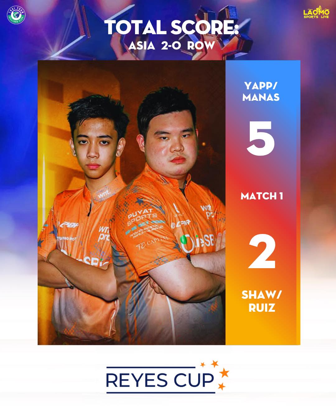 Ở nội dung đôi tiếp theo, Aloysius Yapp và AJ Manas nối dài chuỗi thắng khi vượt qua cặp Sanchez Ruiz – Jayson Shaw 5-2. Dù Yapp – MVP Reyes Cup 2024 – có vài pha đánh thiếu chính xác, Shaw lại mắc lỗi ở tình huống bi số 8, giúp đại diện châu Á tận dụng cơ hội dọn bàn.