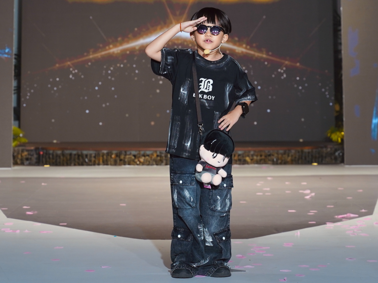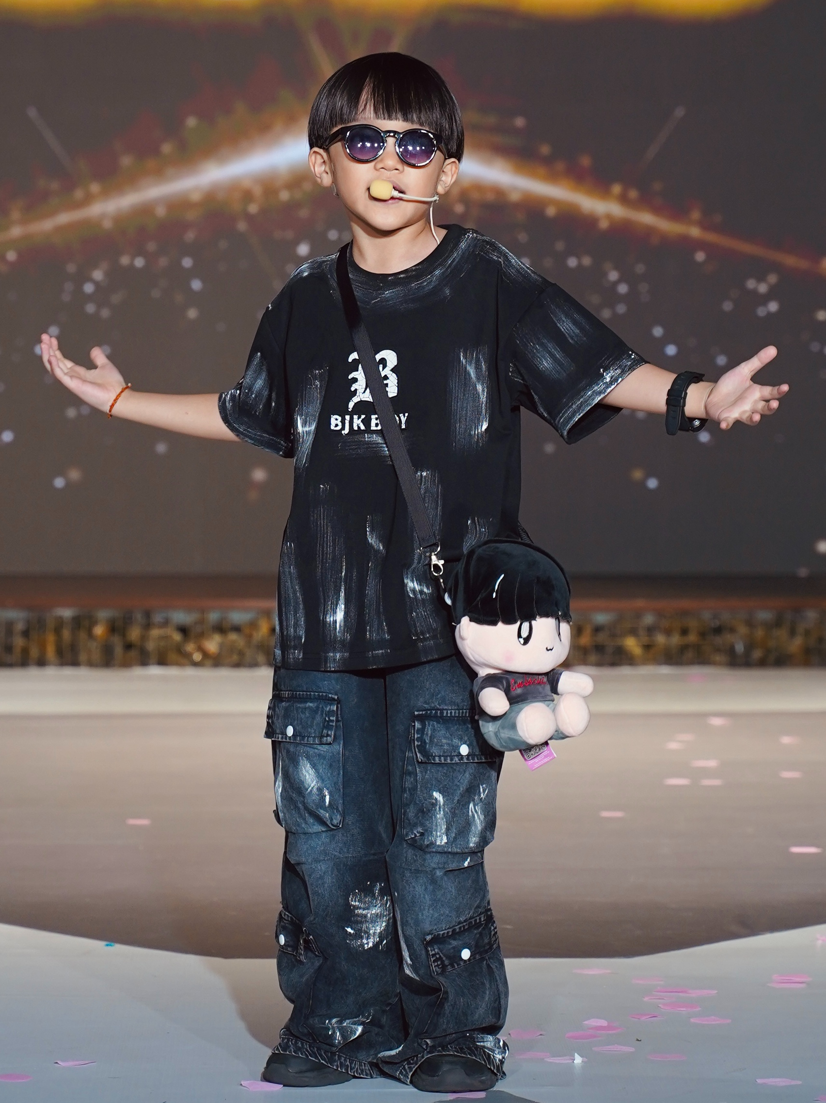 "Em bé chất" Xệ Xệ 8 tuổi bước trên sân khấu thời trang với thần thái tự tin, diện bộ trang phục mang đậm tinh thần hiphop: áo phông oversize, quần túi hộp đen mài bạc, kính râm bản to.