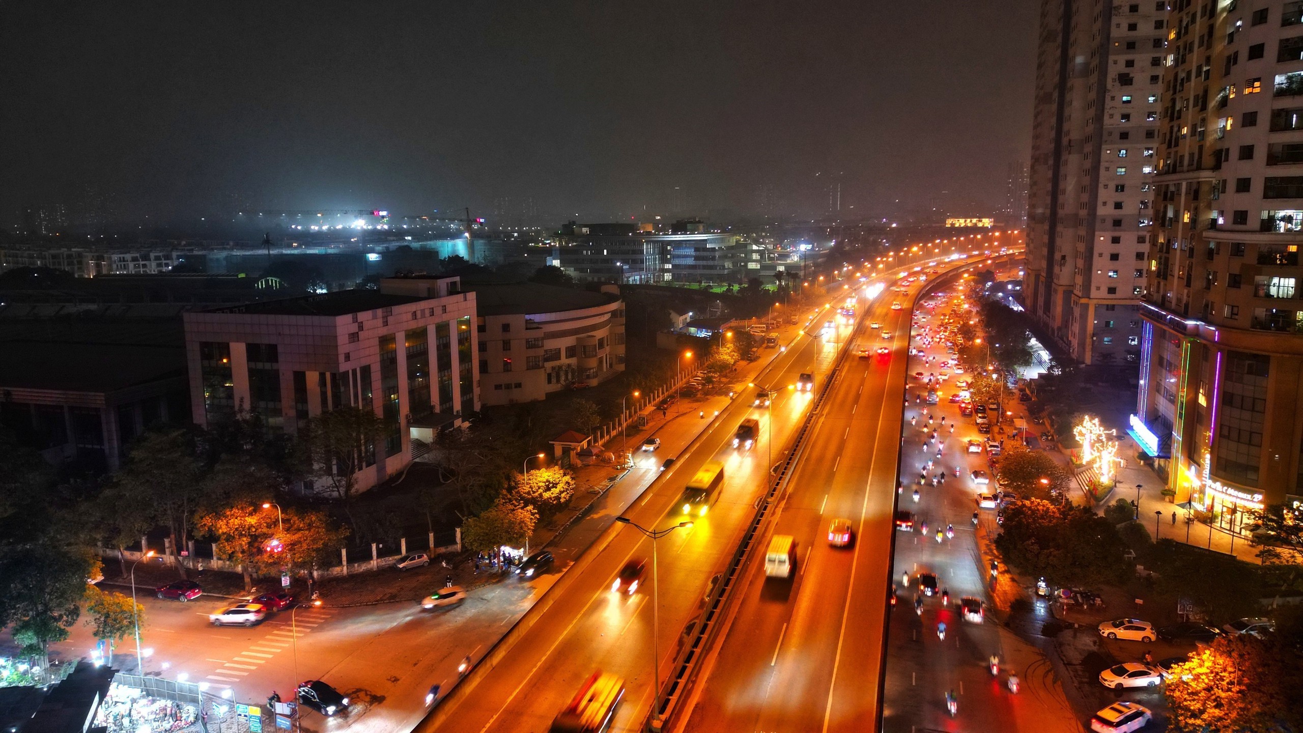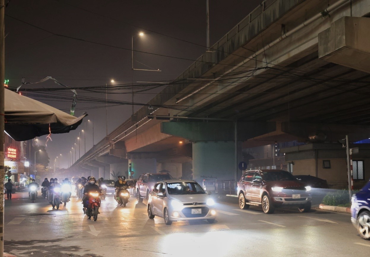 Lối xuống đường Vành đai 3 trên cao gần khu đô thị Linh Đàm thông thoáng (ảnh chụp lúc 20 giờ 25 phút). Ảnh: Tuấn Anh - TTXVN