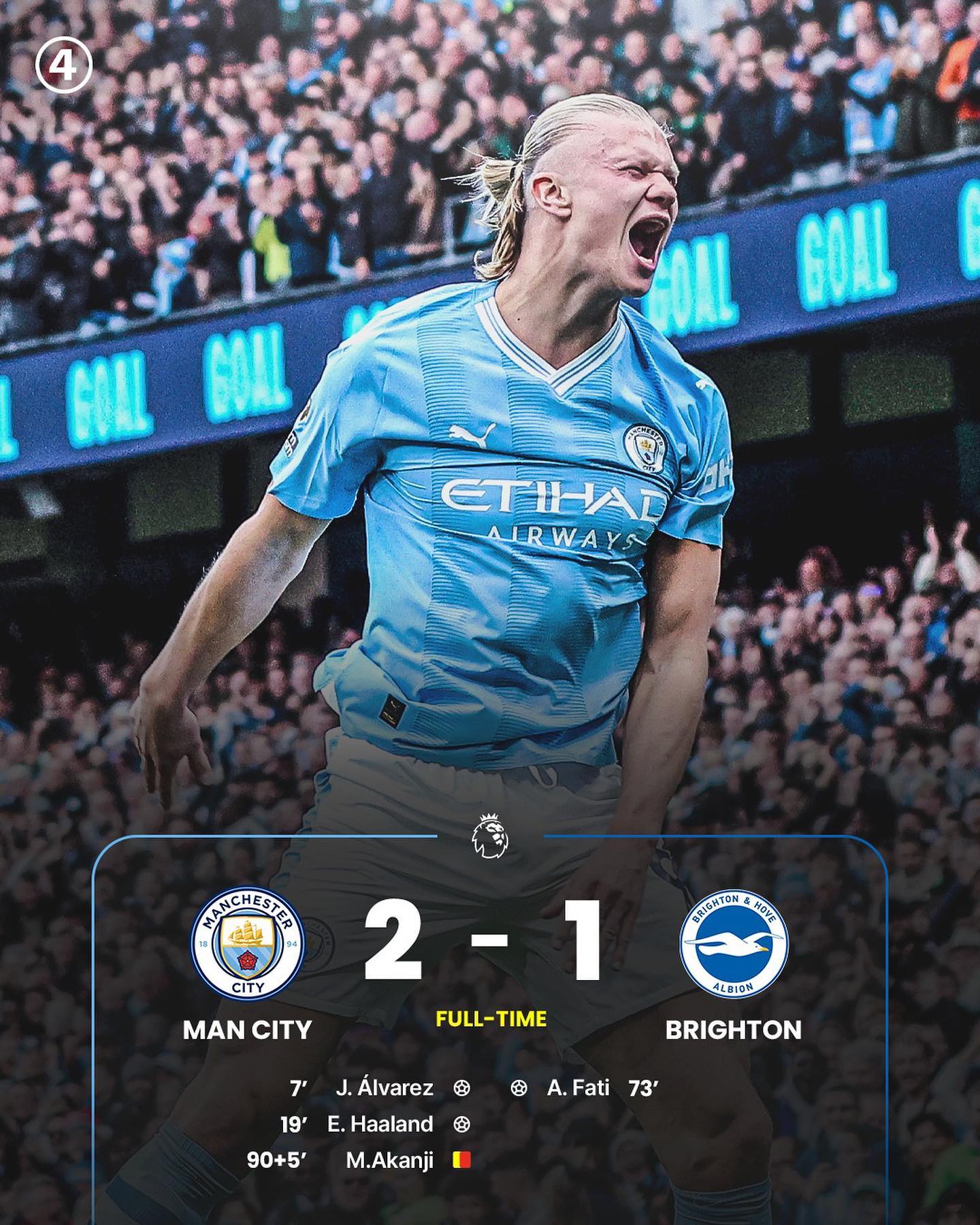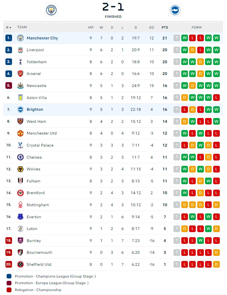 Chung cuộc, Man City thắng 2-1 trước Brighton. Đội bóng của HLV Pep Guardiola giành ngôi đầu bảng từ tay của Liverpool. Man City đang có 21 điểm sau 9 trận, nhiều hơn 1 điểm so với Liverpool.