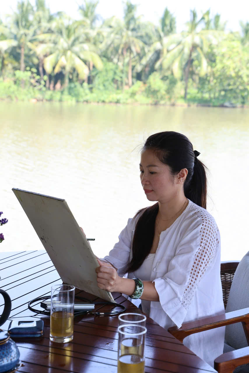 Họa sĩ Phạm Thu Hà (bìa trái) trong một chuyến ký họa