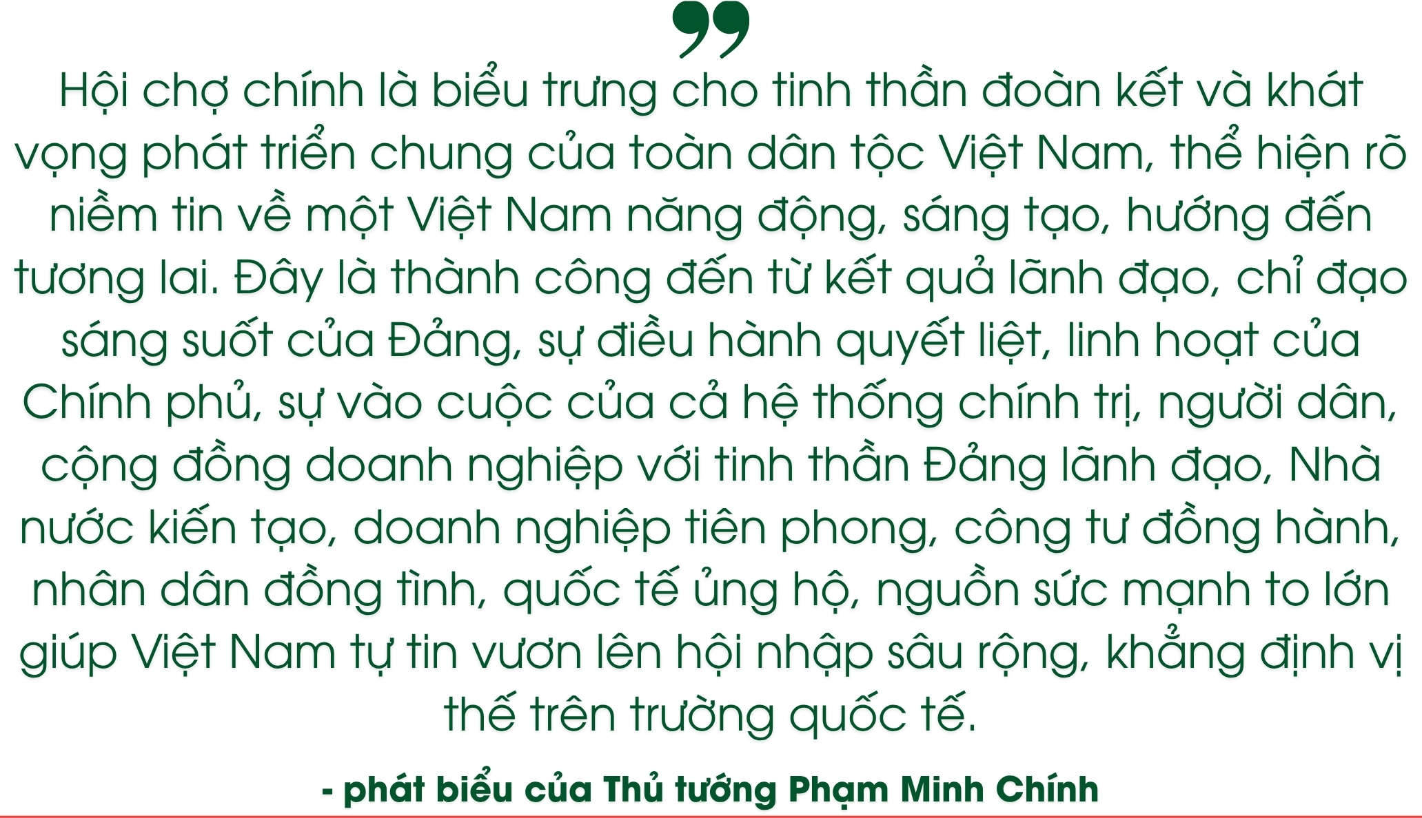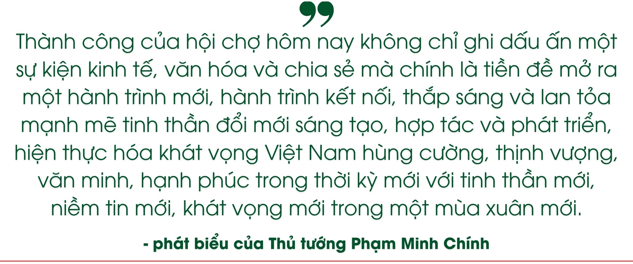 Đề nghị ấy của Thủ tướng phác họa một trạng thái phát triển mới: kinh tế bắt tay văn hóa, công nghệ nâng đỡ và lan tỏa bản sắc, trách nhiệm xã hội trở thành đạo lý thị trường. Từ một hội chợ, chúng ta nhìn thấy một hành trình kết nối, thắp sáng, lan tỏa tinh thần đổi mới sáng tạo và hợp tác, hiện thực hóa khát vọng về một Việt Nam hùng cường, thịnh vượng, văn minh, hạnh phúc.