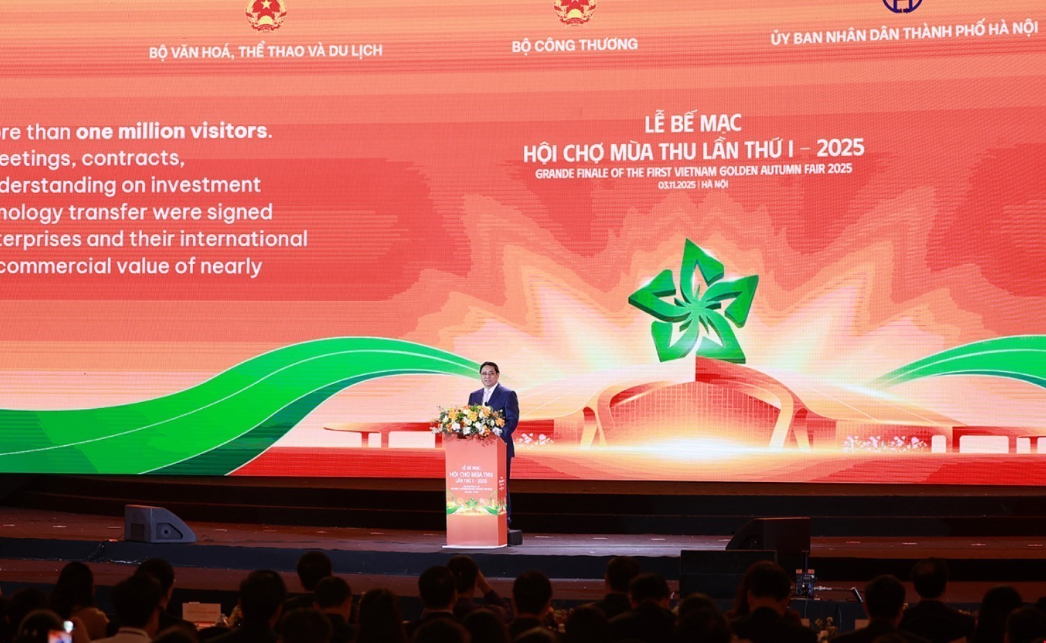 Thủ tướng Phạm Minh Chính phát biểu bế mạc Hội chợ Mùa thu lần thứ nhất - năm 2025 tối ngày 3/11 tại Trung tâm Triển lãm Quốc gia, Đông Anh, Hà Nội