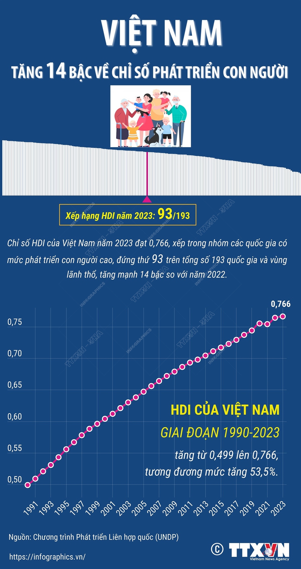 Báo cáo phát triển con người (HDR) 2025 của Chương trình Phát triển Liên hợp quốc (UNDP) tại Việt Nam được công bố ngày 12/5/2025 cho biết: Chỉ số HDI của Việt Nam năm 2023 đạt mức 0,766, được xếp vào nhóm các quốc gia có mức phát triển con người cao (đứng thứ 93 trên tổng số 193 quốc gia và vùng lãnh thổ). Từ năm 1990 đến năm 2023 chỉ số HDI của Việt Nam đã được nâng từ mức 0,499 lên 0,766, tăng 53,5%.
