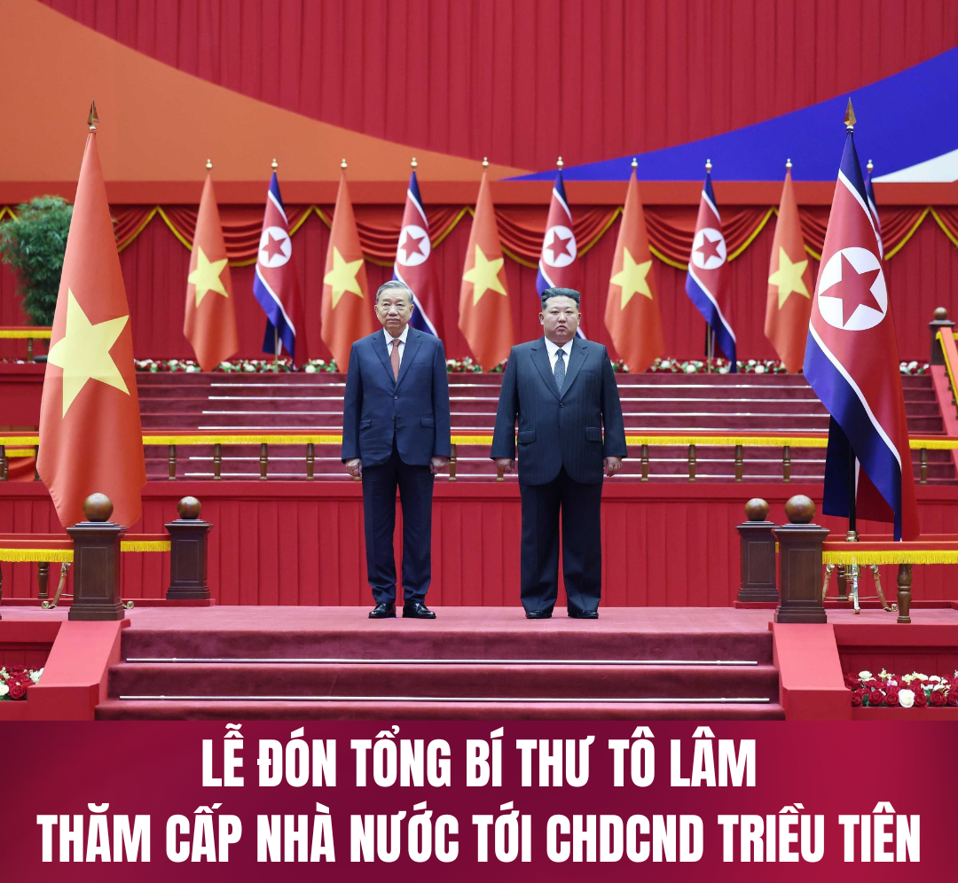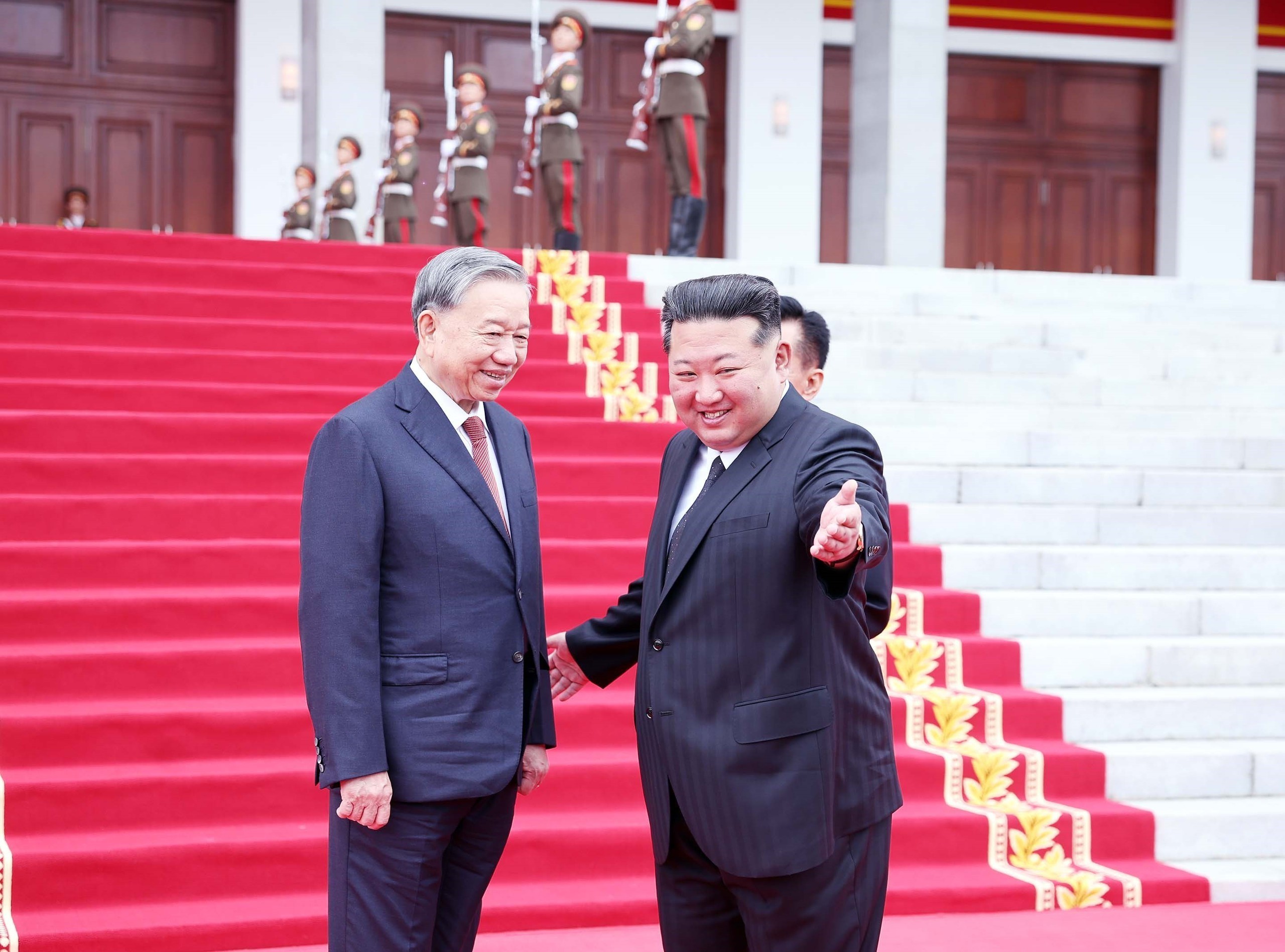 Tổng Bí thư Đảng Lao động Triều Tiên, Chủ tịch Quốc vụ nước Cộng hòa Dân chủ Nhân dân Triều Tiên Kim Jong Un đón và chào mừng Tổng Bí thư Tô Lâm thăm cấp Nhà nước tới Triều Tiên. Hai nhà Lãnh đạo di chuyển đến hàng quan chức và giới thiệu quan chức hai nước, sau đó tiến lên bục danh dự. Đội quân nhạc cử quốc thiều hai nước, trên nền nhạc có bắn 21 loạt đại bác rền vang chào đón Tổng Bí thư Tô Lâm và Đoàn đại biểu cấp cao Việt Nam.