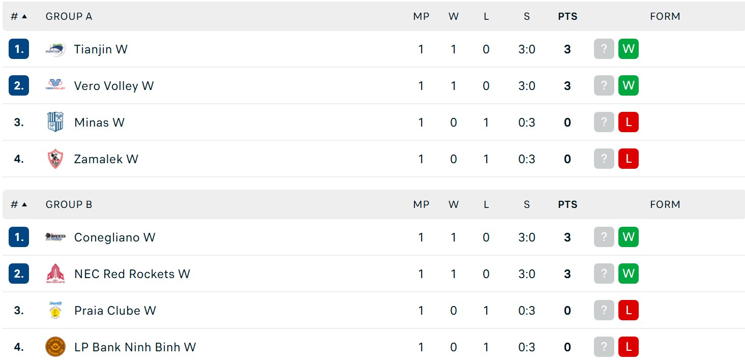 Sau vòng 1, 4 đội bóng có 3 điểm là Tianjin, Vero Volley, Conegliano và NEC Red Rockets. Các đội còn lại như Minas, Zamalek, Praia Clube và Ninh Bình chưa có điểm.