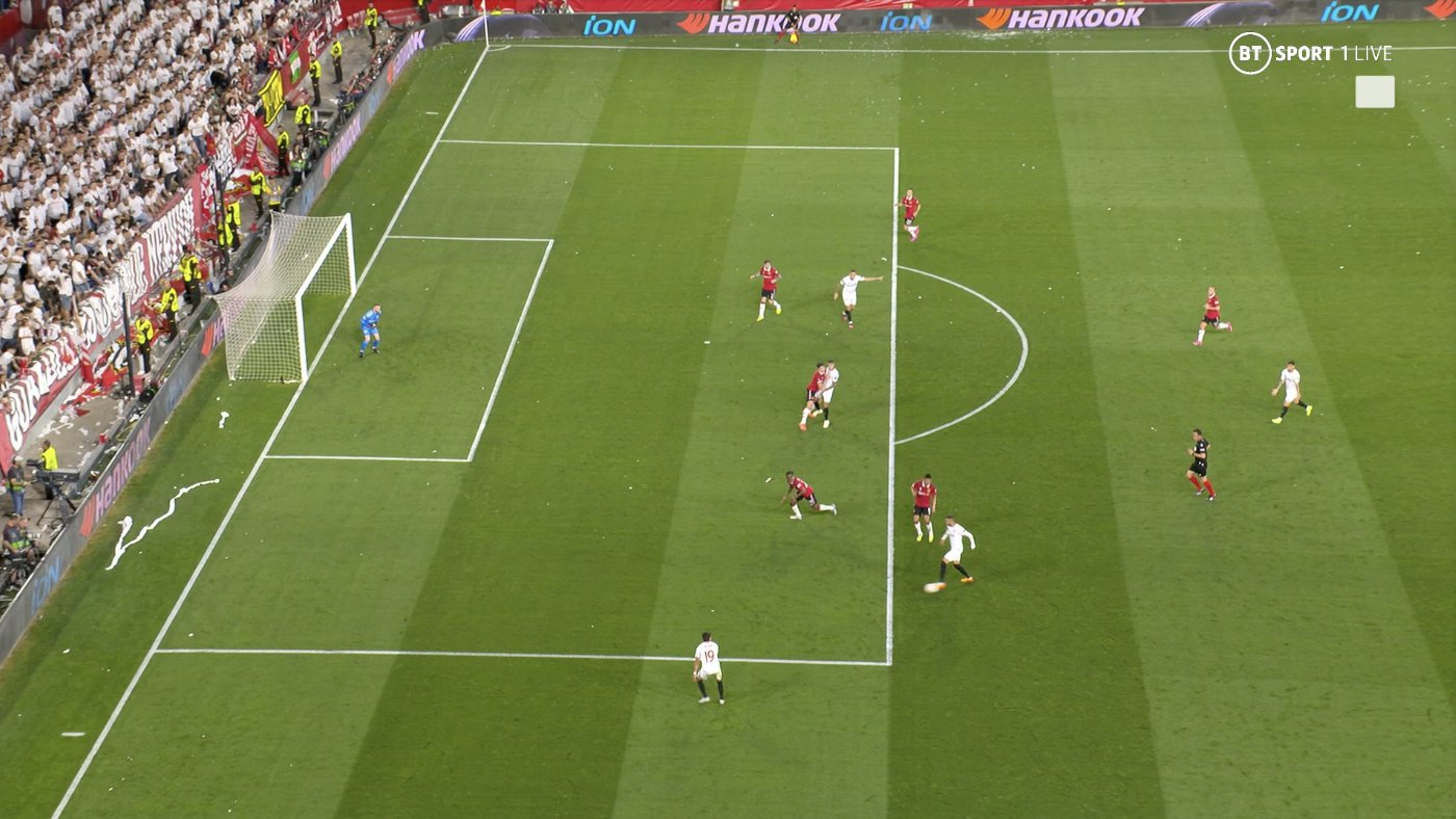 Phút 47, từ quả đá phạt góc của đồng đội, trung vệ Bade của Sevilla có pha đánh… vai. Bóng đập mép dưới xà ngang và đi vào lưới trong sự bất lực của De Gea. Sevilla nâng tỉ số lên 2-0.