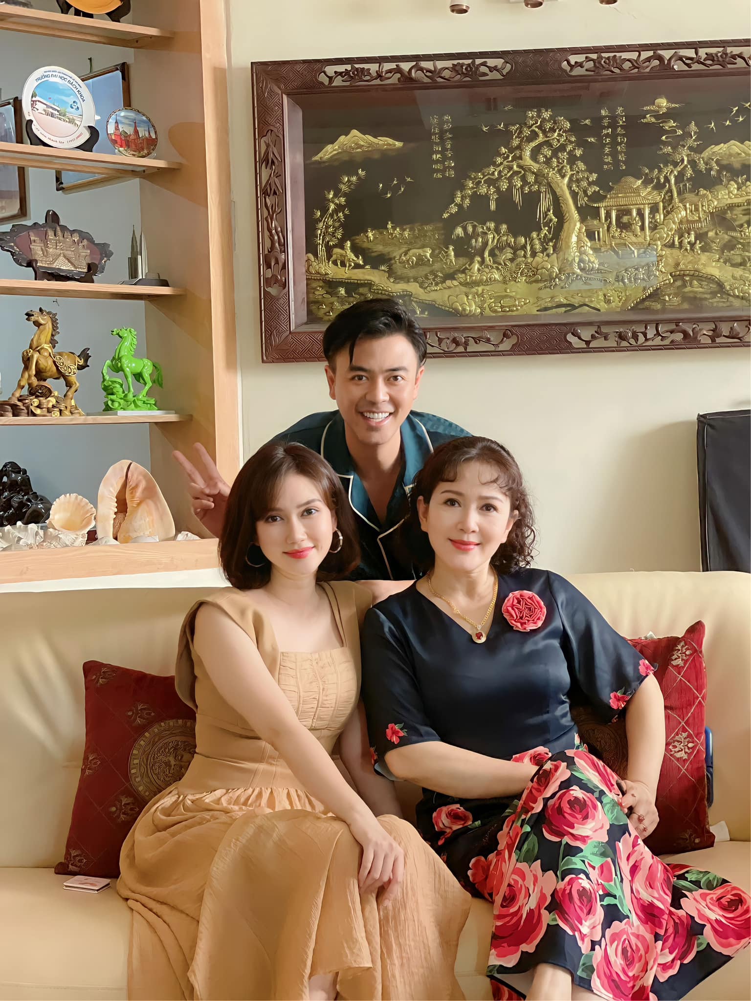 Tuấn Tú chụp ảnh tại hậu trường cùng diễn viên Hương Giang (trái) và NSND Minh Hòa (phải)