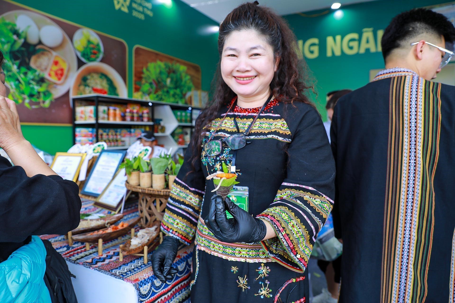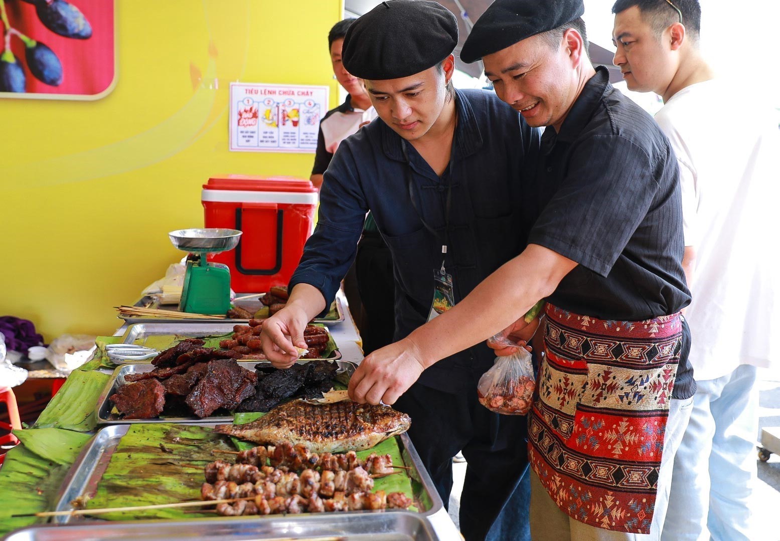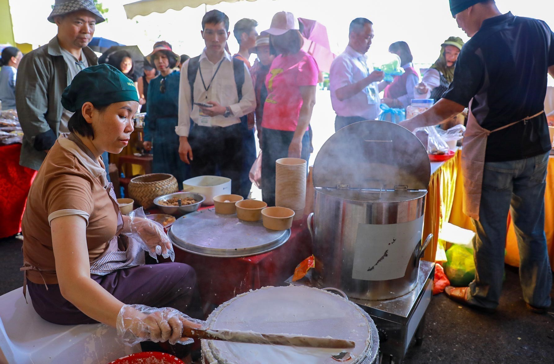 Ấn tượng đầu tiên khi bước vào khu ẩm thực là cảm giác được "ăn bằng mọi giác quan". Người tham quan không chỉ nếm mà còn đứng dõi theo từng thao tác chế biến: bàn tay nghệ nhân tráng bánh mỏng tang, tiếng lửa rộp lên dưới vỉ nướng cá, mùi lá mắc mật thoang thoảng theo gió, tiếng dao chặt dứt khoát, tiếng rao mời ríu rít. Mỗi gian hàng như một sân khấu dân gian mini: nghệ nhân là người kể chuyện, gian bếp là phông nền, còn món ăn là tác phẩm. Trình diễn tại chỗ khiến ẩm thực trở lại đúng vị trí của nó - một di sản sống, không thể trọn vẹn nếu chỉ nhìn qua tủ kính hay gọi qua app.
