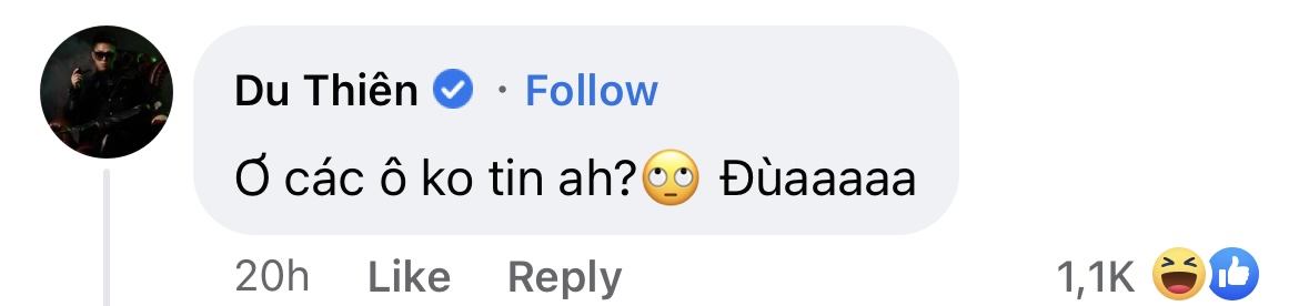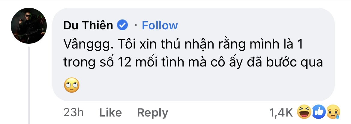 Cụ thể, Du Thiên để lại bình luận dưới một bài đăng về Đoan Minh: "Vâng, tôi xin thú nhận rằng mình là một trong số 12 mối tình mà cô ấy đã bước qua". Chia sẻ của nam ca sĩ khiến cư dân mạng ngờ vực. Đáp lại, anh lại lần nữa úp mở: "Ơ các ông không tin à?".