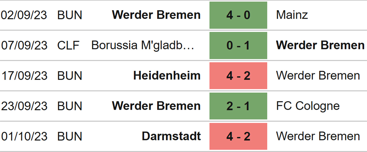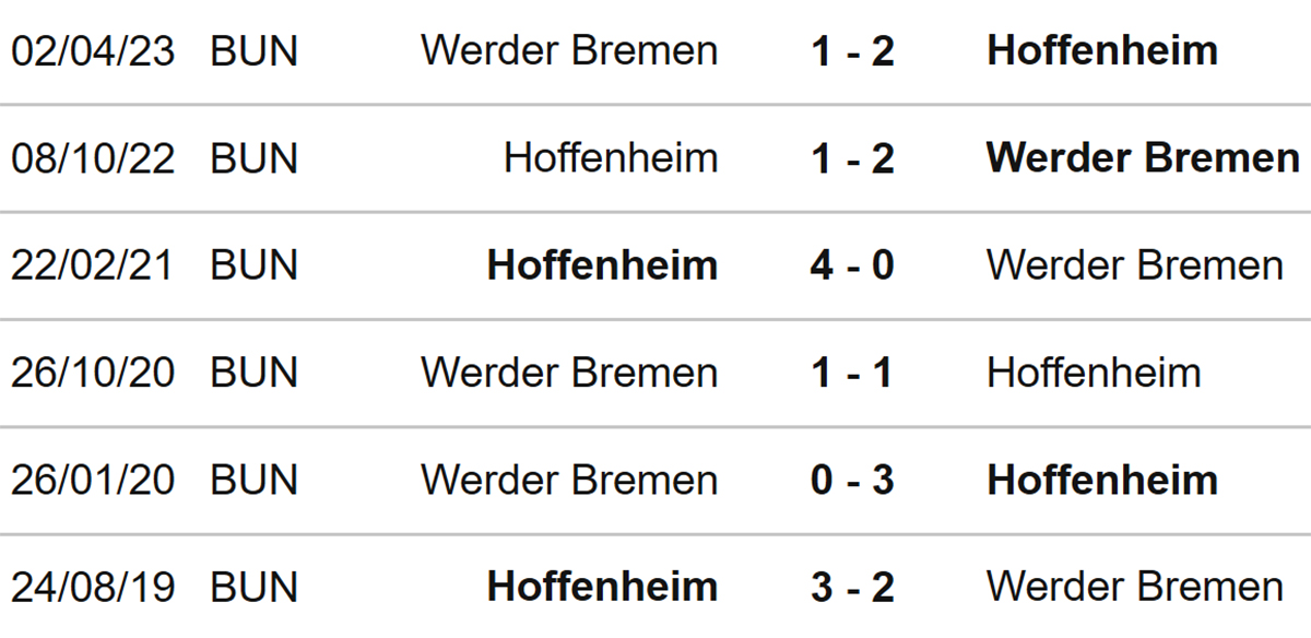 Trong 6 vòng đấu gần nhất, Bremen thắng 2 và thua tới 4. Trái lại, Hoffenheim thắng 4 và thua 2. Xét trên mọi yếu tố, Hoffenheim hoàn toàn có thể giành 3 điểm ngay trển sân Bremen.