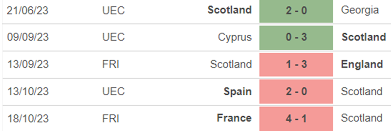 Scotland đã chơi tốt ở những trận đầu tiên tại vòng loại EURO 2024 nhưng thời gian gần đây họ không chơi tốt. Bằng chứng là họ đã thua 3 trận liên tiếp trước Anh, Tây Ban Nha và mới nhất là Pháp. Việc không còn nhiều động lực cũng khiến Scotland khó duy trì được sự tập trung cao nhất.