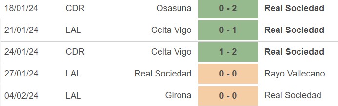 Real Sociedad cũng đã có 5 chiến thắng ở Copa del Rey mùa này, vượt qua Bunol, Andratx, Malaga, Osasuna và Celta Vigo, và mới chỉ để thủng lưới một lần.
