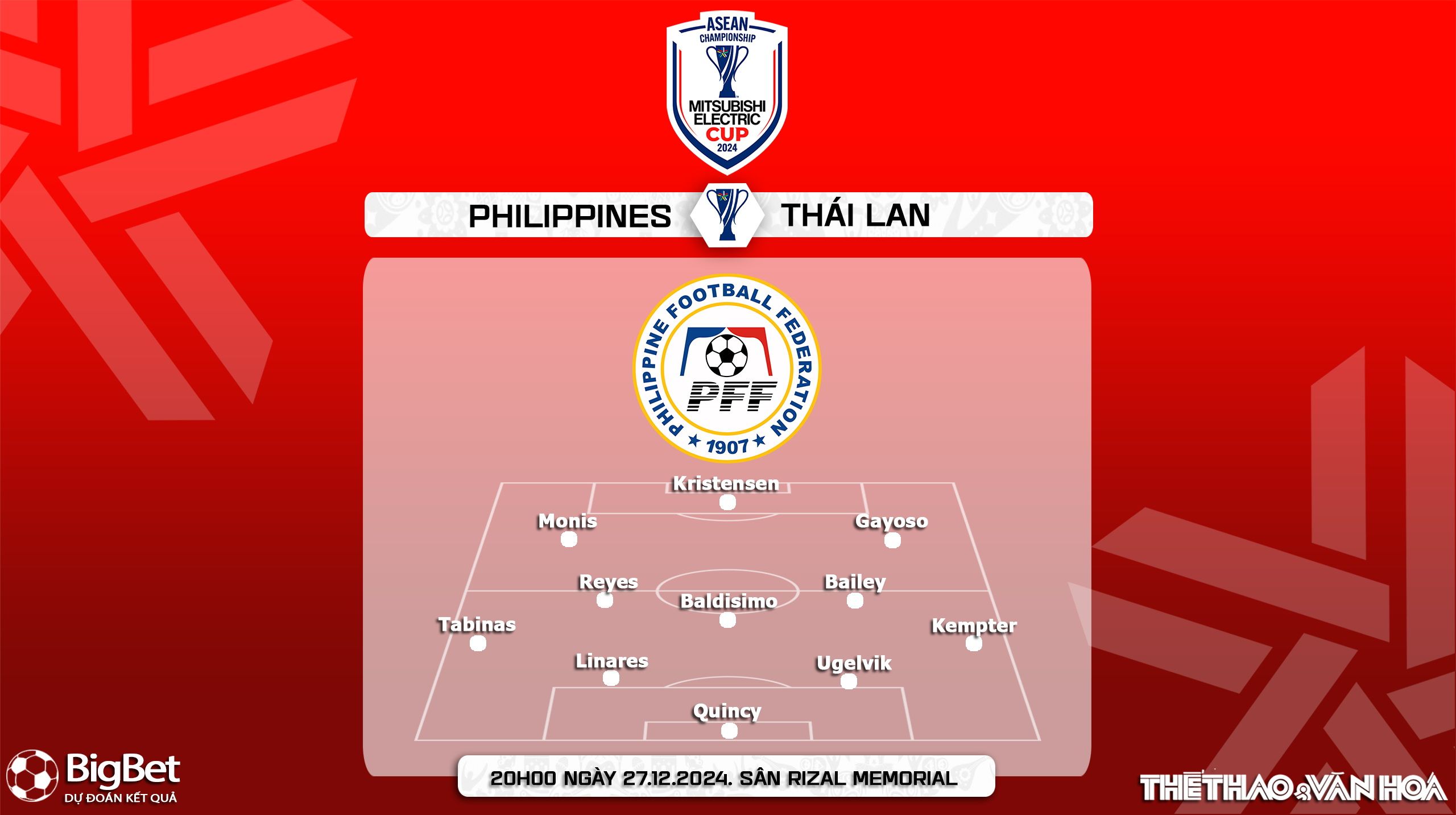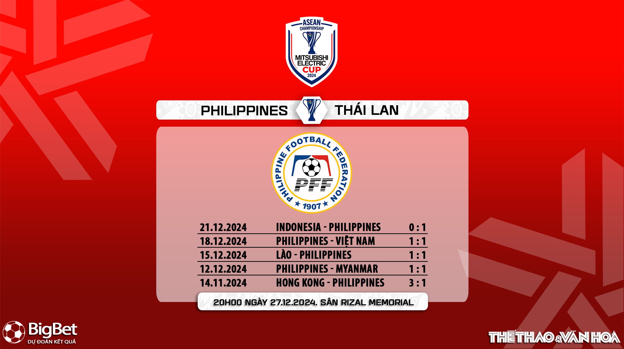 Philippines có lợi thế sân nhà và quen thuộc với mặt sân cỏ nhân tạo. Dù vậy, chất lượng đội hình và kinh nghiệm thi đấu quốc tế của đội chủ nhà vẫn bị đánh giá thấp hơn so với Thái Lan. Không dễ để Philippines có thể tìm kiếm một kết quả có lợi ở trận đấu này và có thể nhận thất bại với cách biệt tối thiểu.