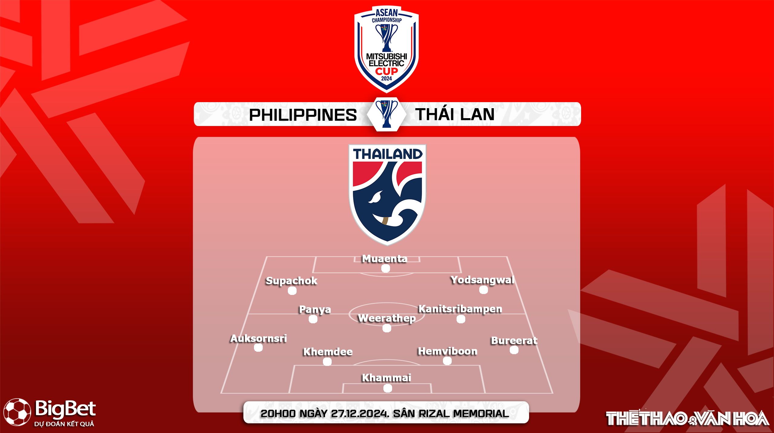 Mặc dù hàng công của Thái Lan thể hiện sức mạnh vượt trội tại vòng bảng ASEAN Cup 2024, nhưng đây là vòng bán kết và tính chất quan trọng của trận đấu khiến 2 đội cần có tính toán thận trọng. Philippines sẽ ưu tiên cho mặt trận phòng ngự, trận đấu được dự báo diễn ra quyết liệt và khó chạm mốc 3 bàn.