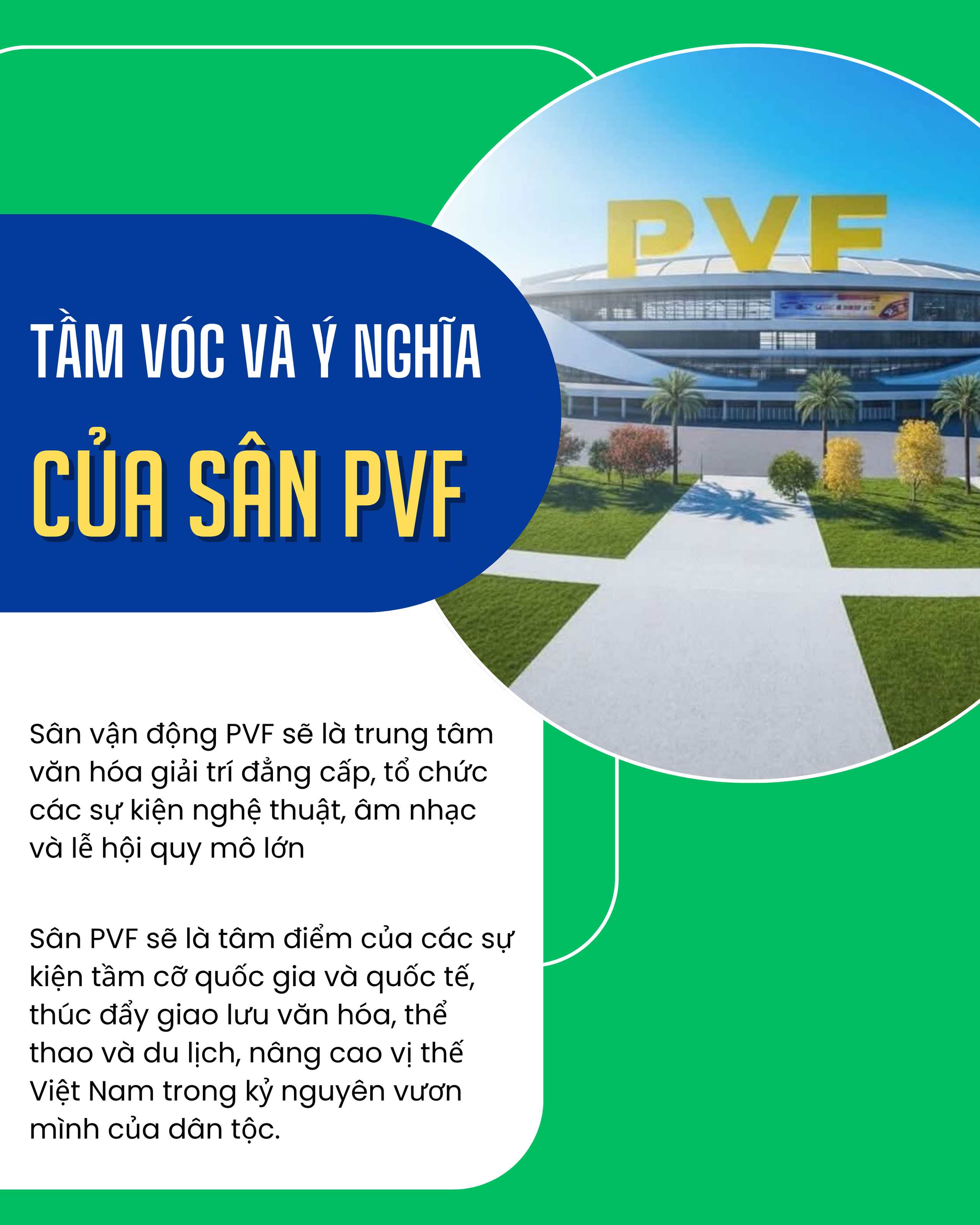 Với thiết kế mang tầm vóc thời đại và công nghệ tiên tiến hàng đầu thế giới, khi đi vào vận hành Sân vận động PVF Công sẽ là trung tâm văn hóa giải trí đẳng cấp, tổ chức các sự kiện nghệ thuật, âm nhạc và lễ hội quy mô lớn, góp phần thu hút đầu tư, thúc đẩy hội nhập, làm phong phú thêm đời sống tinh thần của nhân dân, đóng góp vào sự phát triển hài hòa của xã hội.