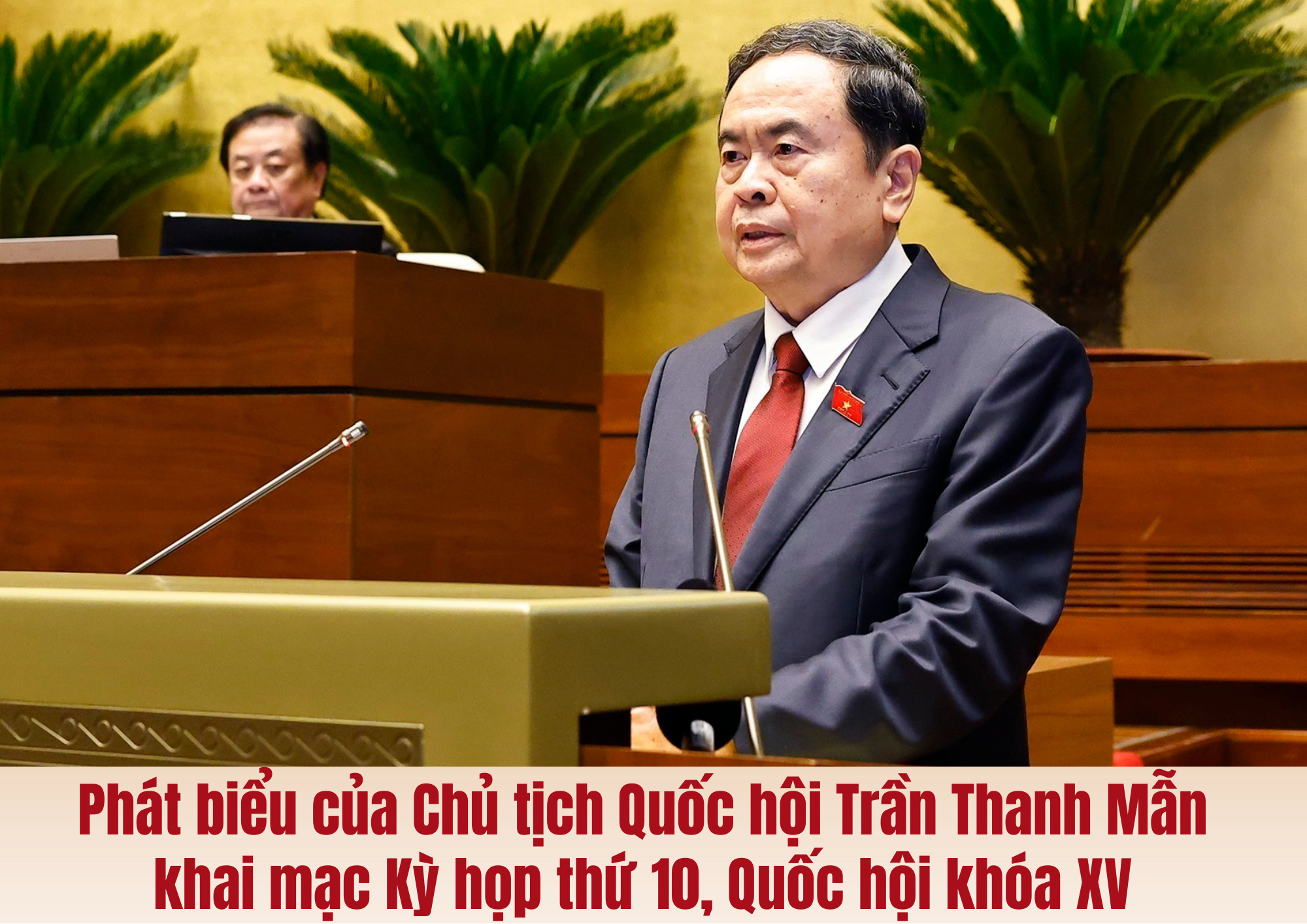 Với tinh thần đó, tôi xin tuyên bố khai mạc Kỳ họp thứ 10, Quốc hội khóa XV. Kính chúc đồng chí Tổng Bí thư Tô Lâm, các đồng chí lãnh đạo, nguyên lãnh đạo Đảng, Nhà nước, Mặt trận Tổ quốc Việt Nam, các vị đại biểu Quốc hội, các vị khách quý, đại diện các đoàn ngoại giao, các tổ chức quốc tế, cán bộ, chiến sĩ lực lượng vũ trang, cử tri và nhân dân cả nước, đồng bào ta ở nước ngoài luôn mạnh khỏe, hạnh phúc và thành công.