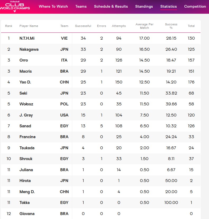 Sau 2 trận đấu, Nguyễn Thị Hoài Mi đang đứng đầu thống kê về chuyền 2 xuất sắc nhất ở giải vô địch thế giới các CLB. Theo số liệu, Hoài Mi có 34 lần chuyền bóng thành công và xếp trên 162 VĐV trong BXH của Volleyball World. Đứng thứ 2 trong danh sách này là VĐV Nhật Bản Tsukasa Nakagawa của NEC Red Rockets Kawasaki với 33 lần chuyền bóng thành công.