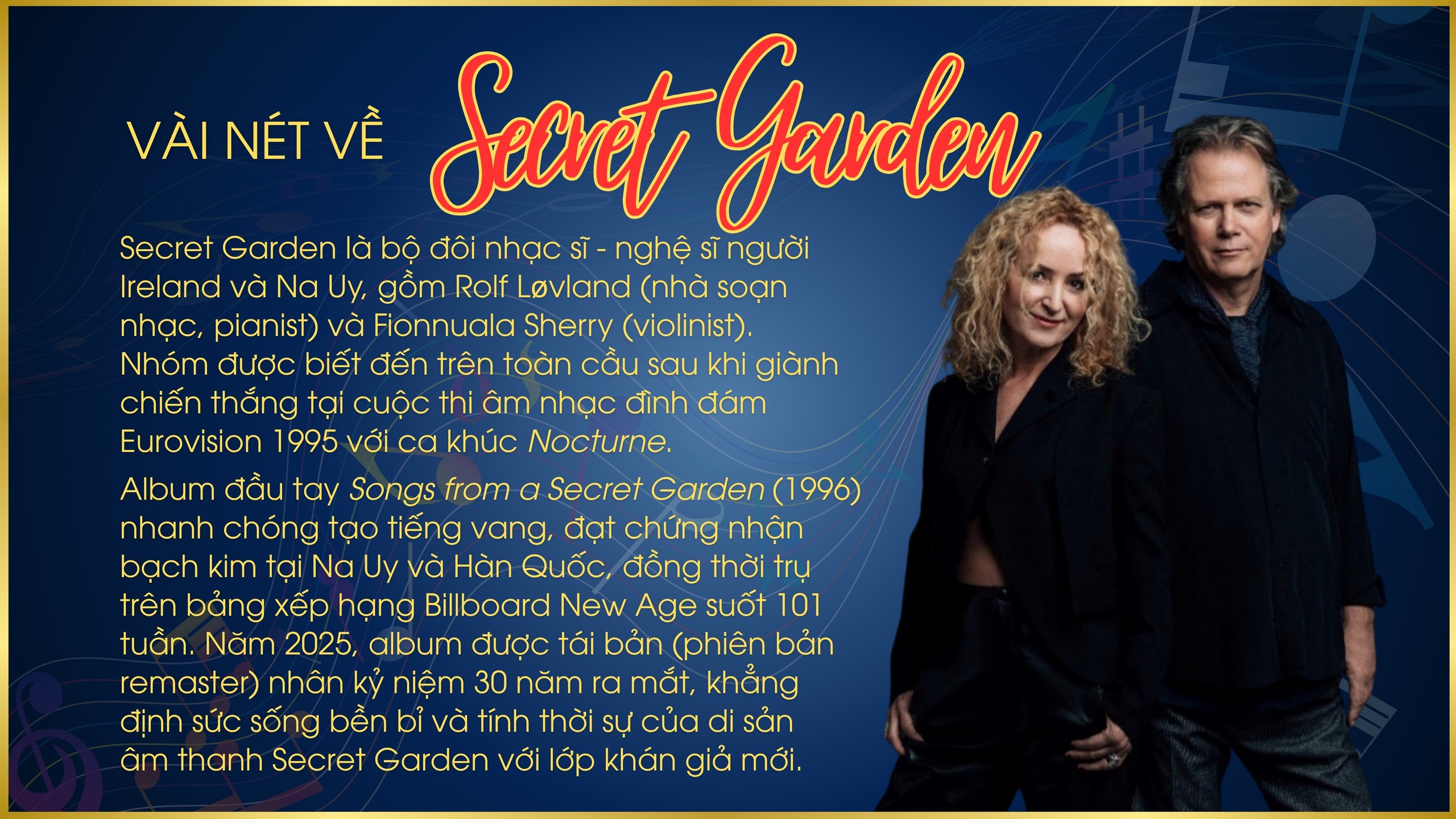 Vào 19h30 tối 18/10 tới, Secret Garden Live in Vietnam sẽ diễn ra tại Trung tâm Hội nghị Quốc gia (Hà Nội). Đêm diễn không chỉ là cuộc gặp gỡ giữa khán giả Việt Nam và bộ đôi từng định hình thẩm mỹ new age (âm nhạc thư giãn, hướng nội) - crossover (giao thoa giữa cổ điển và đại chúng) trên thế giới, mà còn là một nghi thức lắng nghe được phục hồi - nơi giai điệu dẫn đường, im lặng có tiếng nói, và ký ức gặp hiện tại trong một nhịp thở chung.
