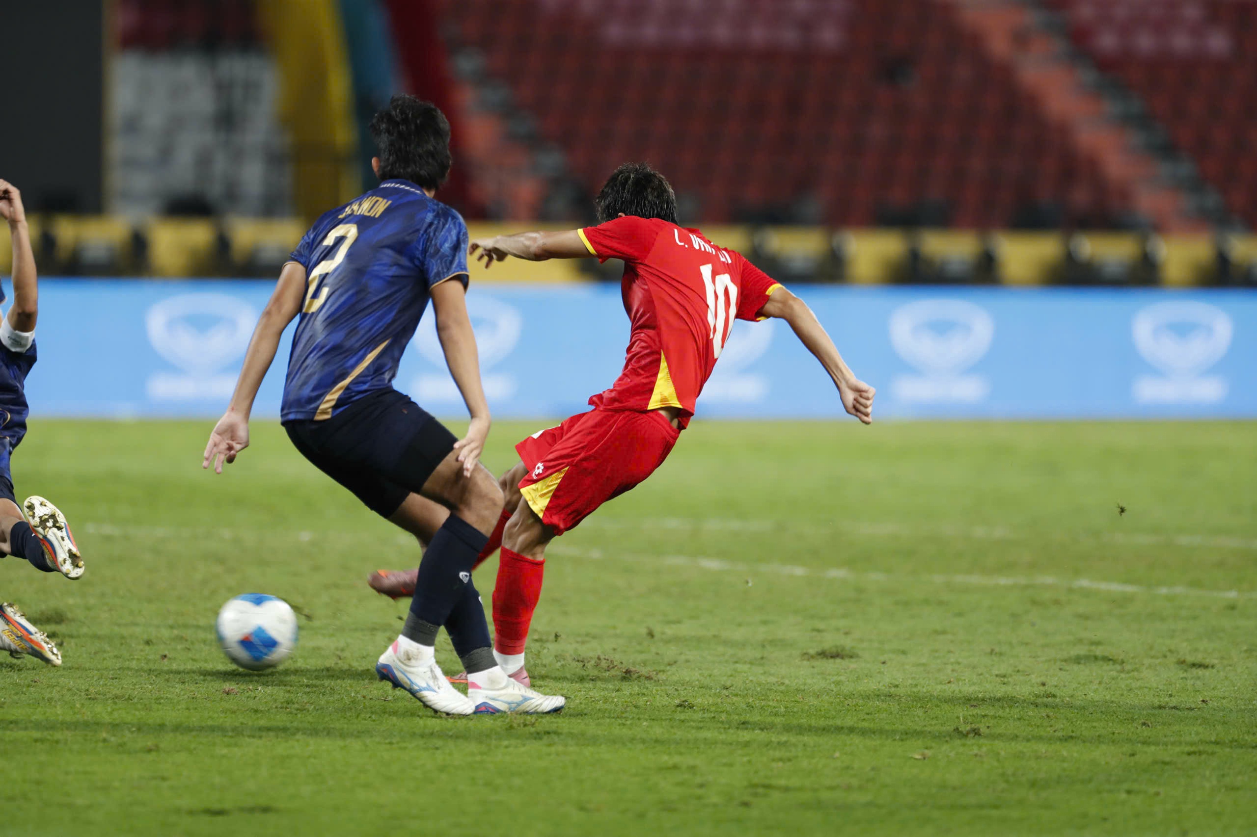 Trận chung kết mở ra với kịch bản đầy thử thách cho thầy trò HLV Kim Sang Sik. Trước sức ép từ khán đài và lối chơi chủ động của Thái Lan, U22 Việt Nam nhập cuộc thận trọng nhưng sớm rơi vào thế khó. Phút 21, Yotsakorn Burapha mở tỷ số bằng cú đá phạt hàng rào đẳng cấp, dù thủ môn Trung Kiên đã chạm tay vào bóng. Chưa kịp ổn định lại đội hình, hàng thủ áo đỏ tiếp tục bị khoan phá. Phút 31, đội trưởng Seksan Ratree tận dụng pha phản công nhanh, xử lý kỹ thuật rồi dứt điểm hiểm hóc, nâng tỷ số lên 2-0 cho "Voi chiến".