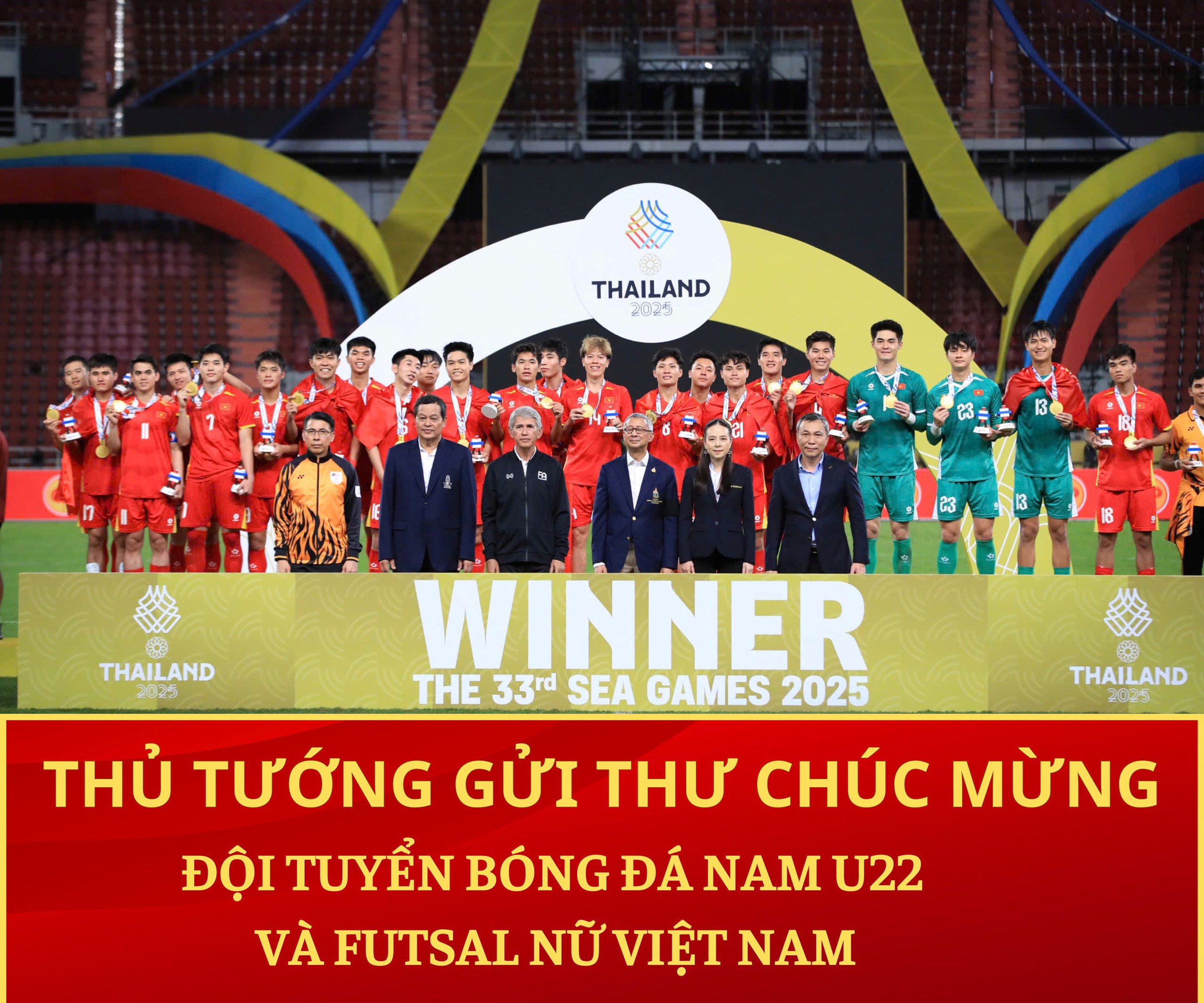 Thay mặt Chính phủ và người hâm mộ bóng đá nước nhà, tôi nồng nhiệt chúc mừng Ban huấn luyện, toàn thể Đội tuyển bóng đá nam U22 quốc gia và Đội tuyển nữ Futsal quốc gia đã kiên cường thi đấu và xuất sắc giành Huy chương Vàng SEA Games 33. Đây là thành tích tuyệt vời, ghi nhận sự nỗ lực và cống hiến hết mình của các Đội tuyển trong cả hành trình tại SEA Games 33.