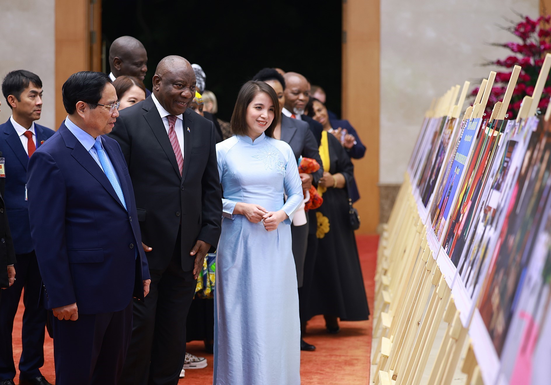 Thủ tướng Phạm Minh Chính và Tổng thống Cộng hòa Nam Phi Matamela Cyril Ramaphosa tham quan trưng bày ảnh về quan hệ hợp tác giữa hai nước do Thông tấn xã Việt Nam thực hiện