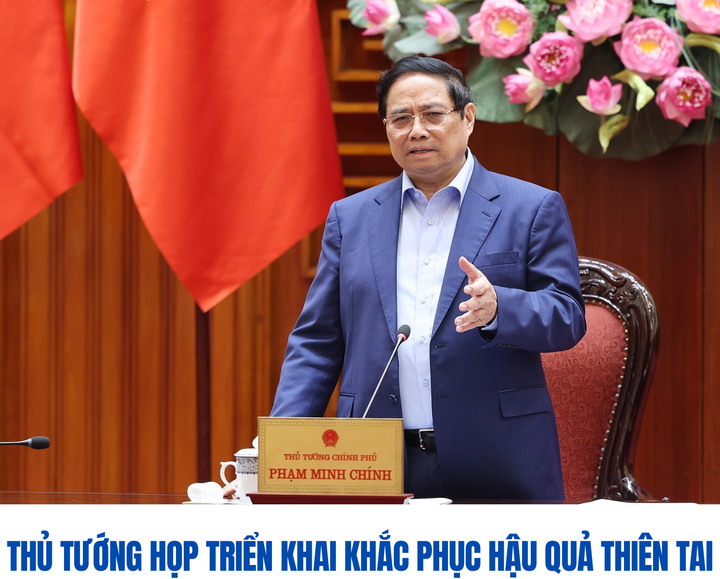 Thủ tướng Phạm Minh Chính chủ trì họp khắc phục hậu quả thiên tai sau bão. Ảnh: Dương Giang-TTXVN