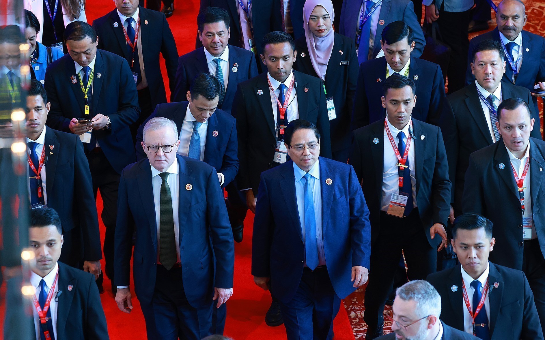 Thủ tướng Phạm Minh Chính và Thủ tướng Australia Anthony Albanese đến dự Hội nghị Cấp cao Đông Á (EAS) lần thứ 20. Ảnh: Dương Giang-TTXVN