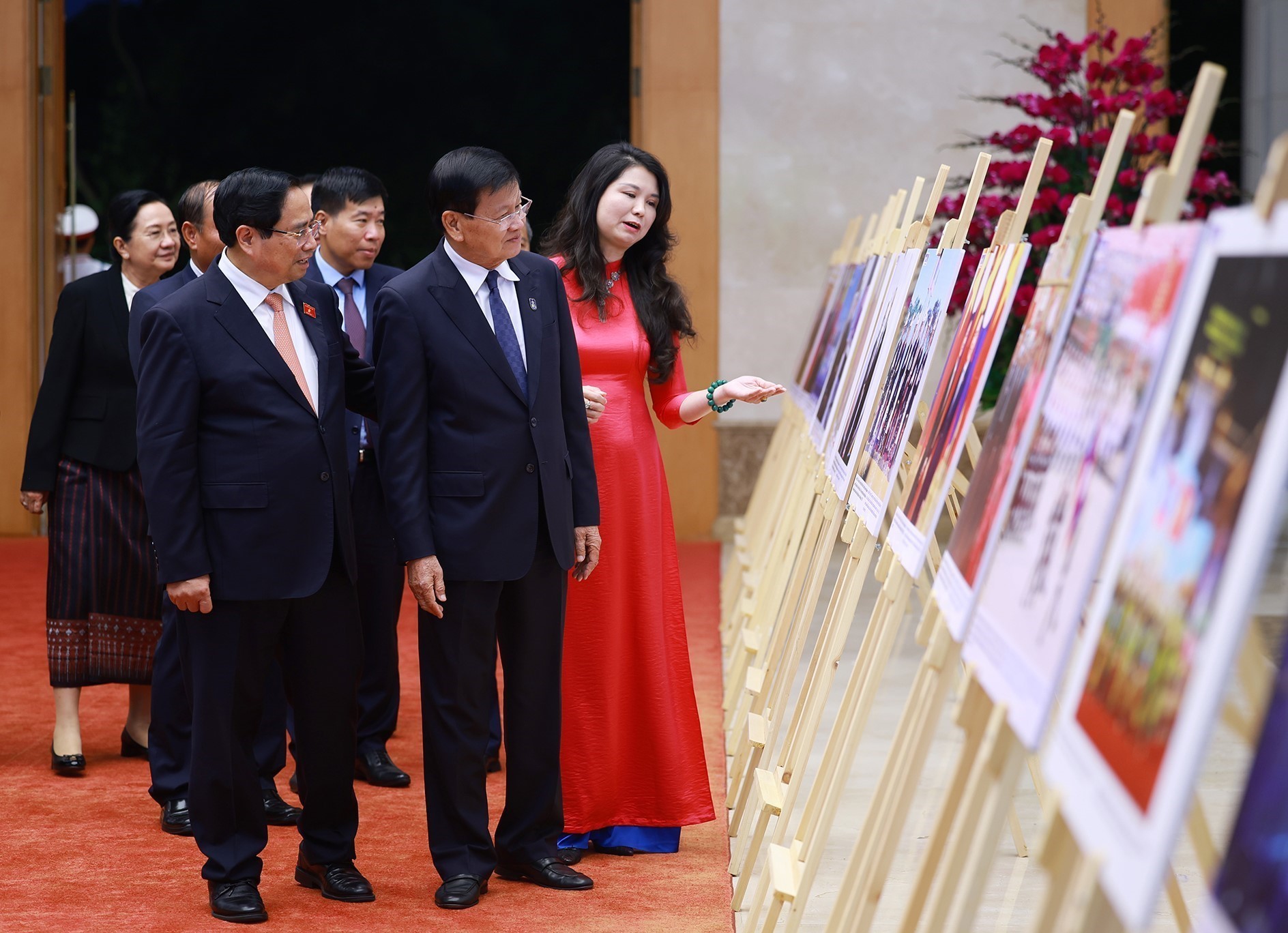 Thủ tướng Phạm Minh Chính và Tổng Bí thư, Chủ tịch nước Lào Thongloun Sisoulith tham quan trưng bày ảnh về quan hệ hơp tác giữa hai nước do TTXVN thực hiện. Ảnh: Dương Giang-TTXVN