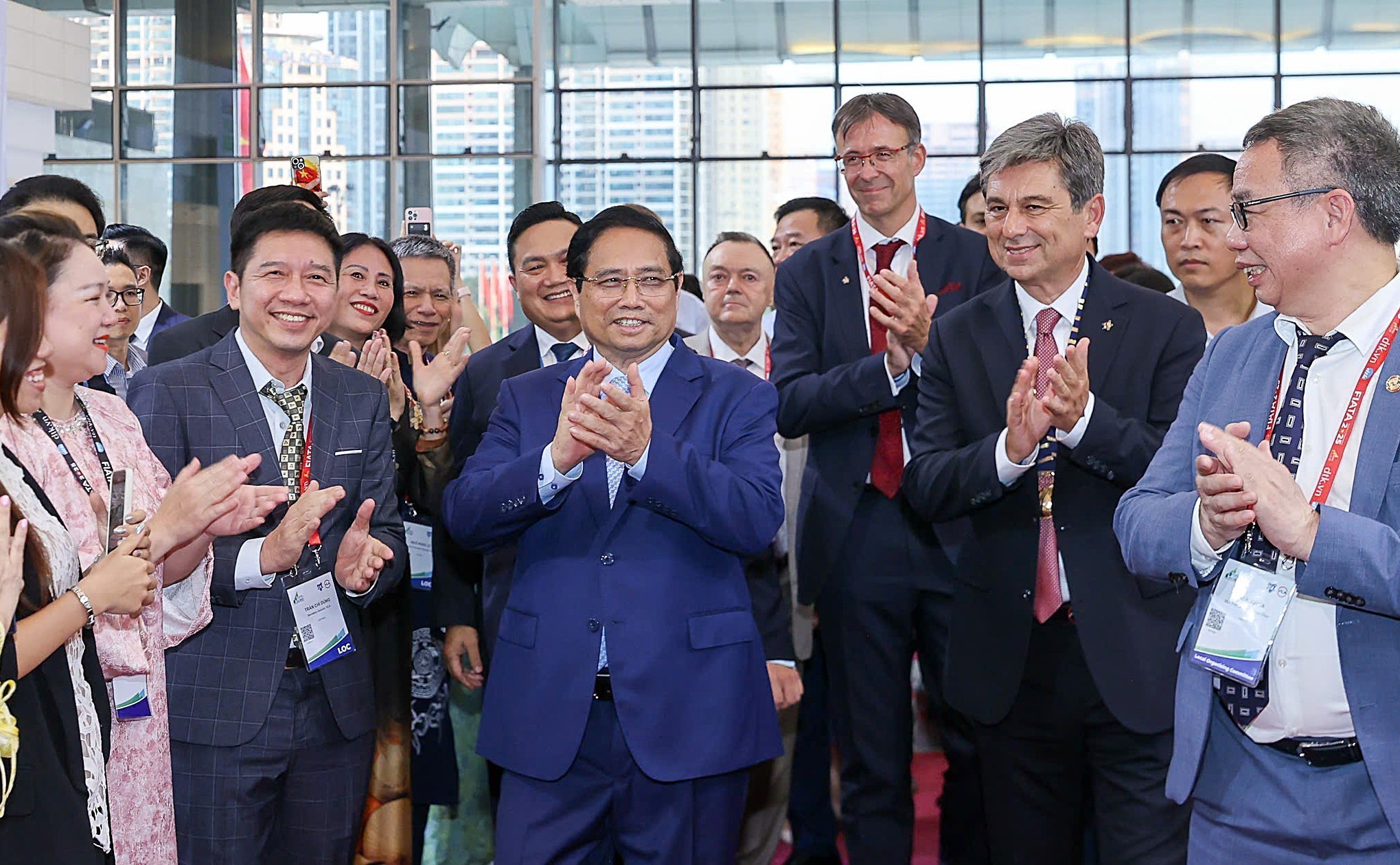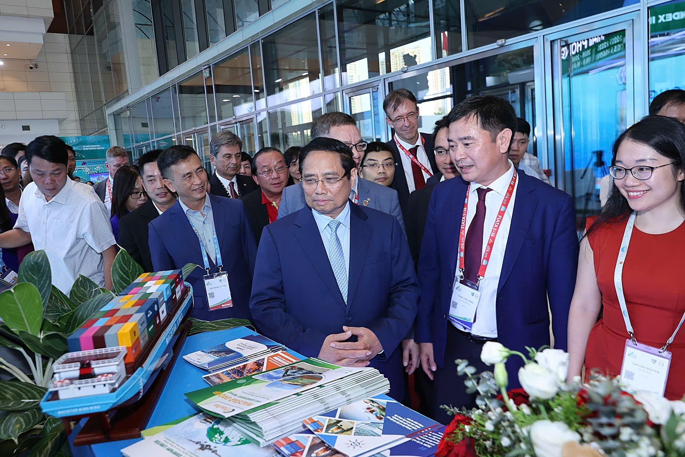 Thủ tướng Phạm Minh Chính tham quan các gian hàng tại Đại hội Thế giới Liên đoàn các Hiệp hội giao nhận vận tải quốc tế 2025 (FIATA World Congress 2025). Ảnh: Dương Giang-TTXVN