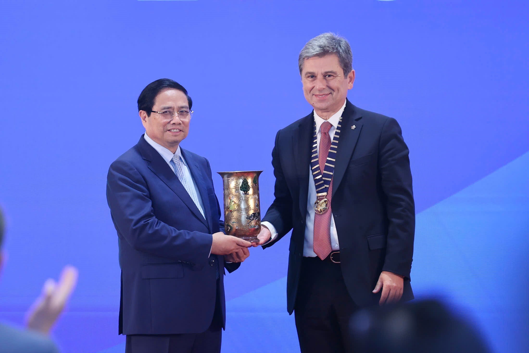 Nhiệt liệt hoan nghênh, chào mừng các quý vị đại biểu, khách quý tham dự Đại hội FIATA năm 2025, Thủ tướng Phạm Minh Chính tin tưởng Đại hội sẽ thành công tốt đẹp, để lại nhiều ấn tượng sâu sắc và góp phần quan trọng tiếp tục thúc đấy ngành logistics thế giới phát triển mạnh mẽ, hiệu quả, theo hướng xanh, số và bền vững trong thời gian tới.