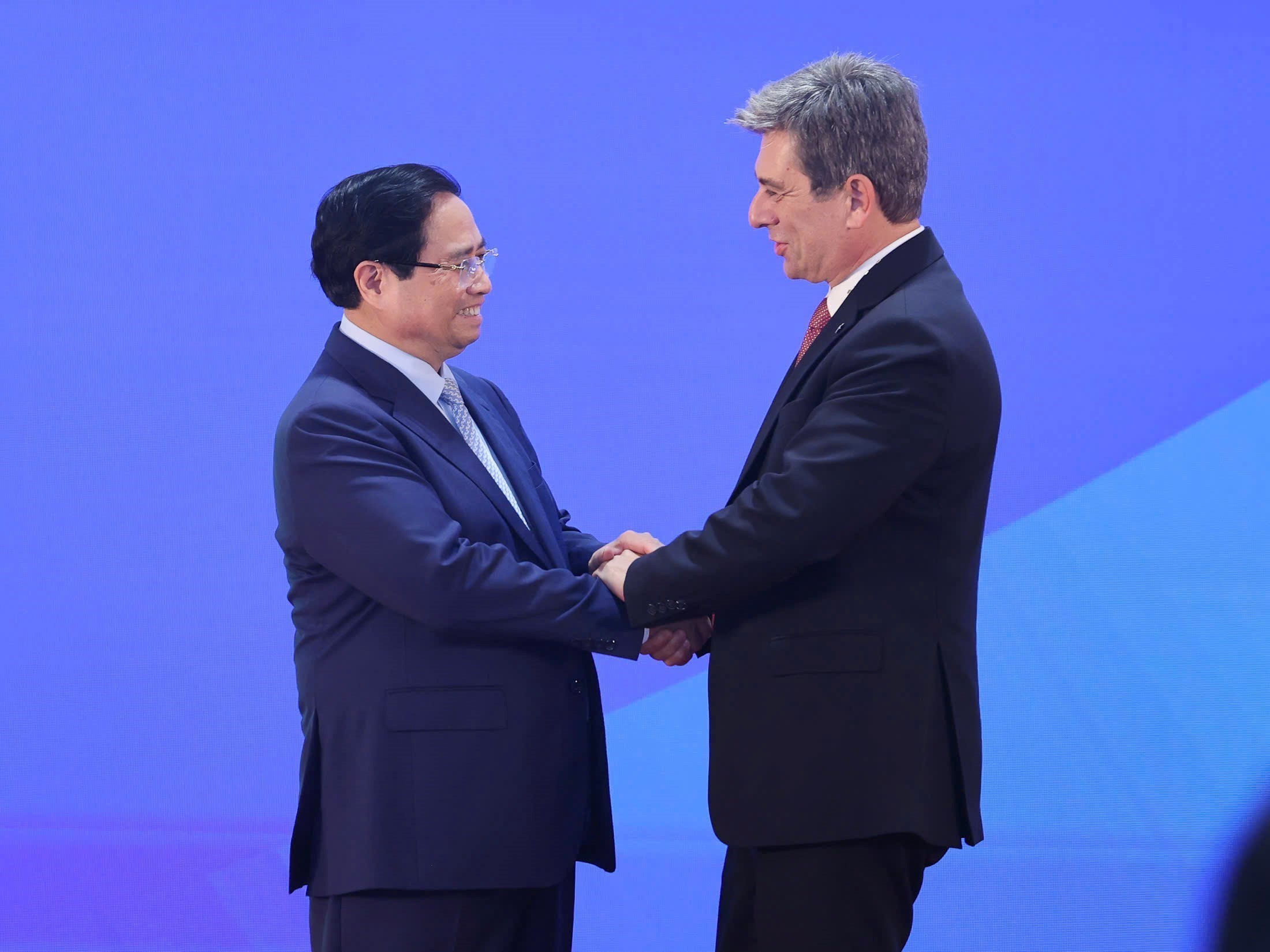 Thủ tướng Phạm Minh Chính và ông Turgut Erkeskin, Chủ tịch Liên đoàn các Hiệp hội giao nhận vận tải quốc tế. Ảnh: Dương Giang-TTXVN