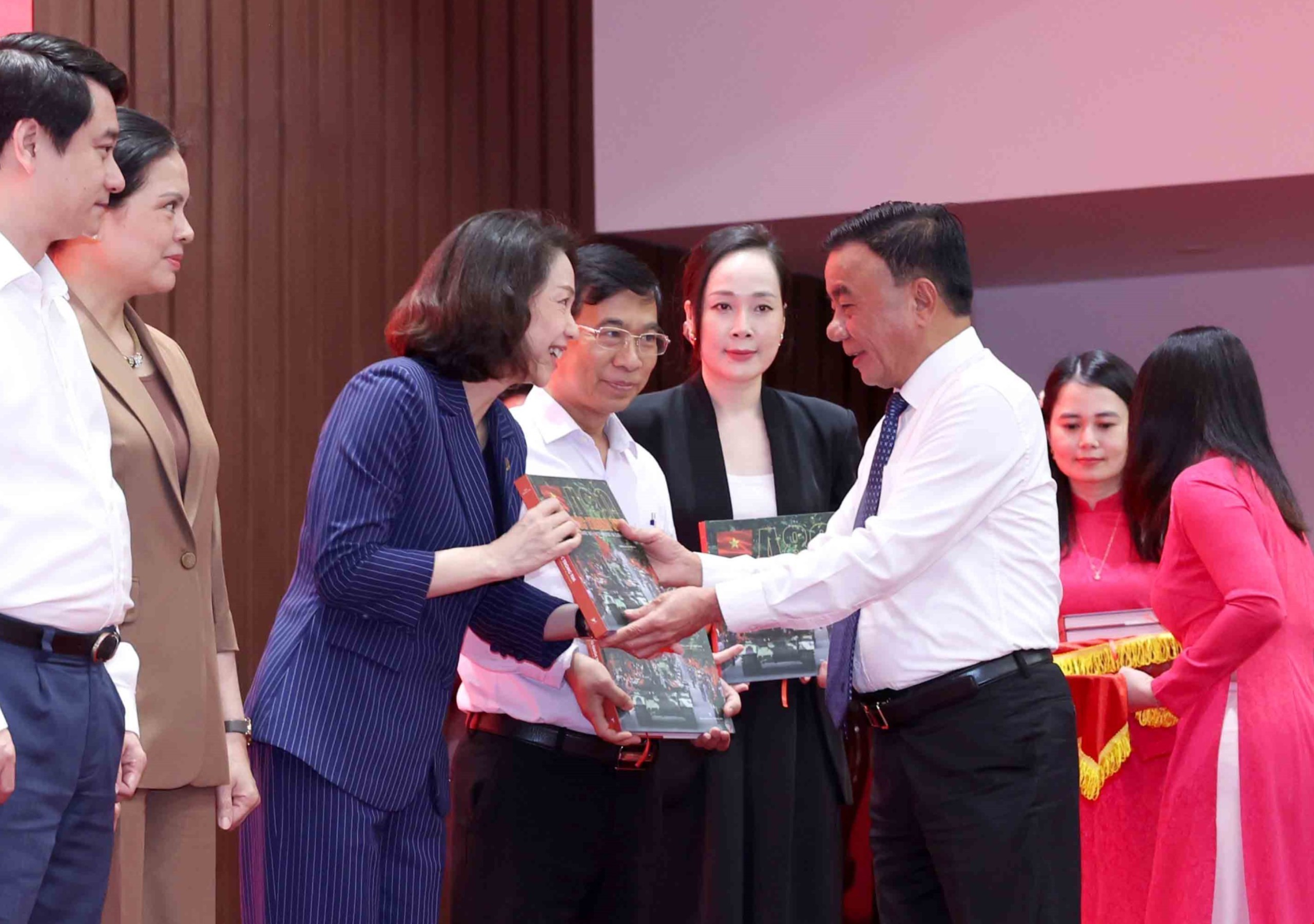 Đồng chí Trần Cẩm Tú, Uỷ viên Bộ Chính trị, Thường trực Ban Bí thư và đồng chí Nguyễn Trọng Nghĩa, Uỷ viên Bộ Chính trị, Bí thư Trung ương Đảng, Trưởng Ban Tuyên giáo và Dân vận Trung ương trao tặng sách ảnh "A80: Tổ quốc trong tim" cho các đơn vị. Ảnh: Phương Hoa - TTXVN