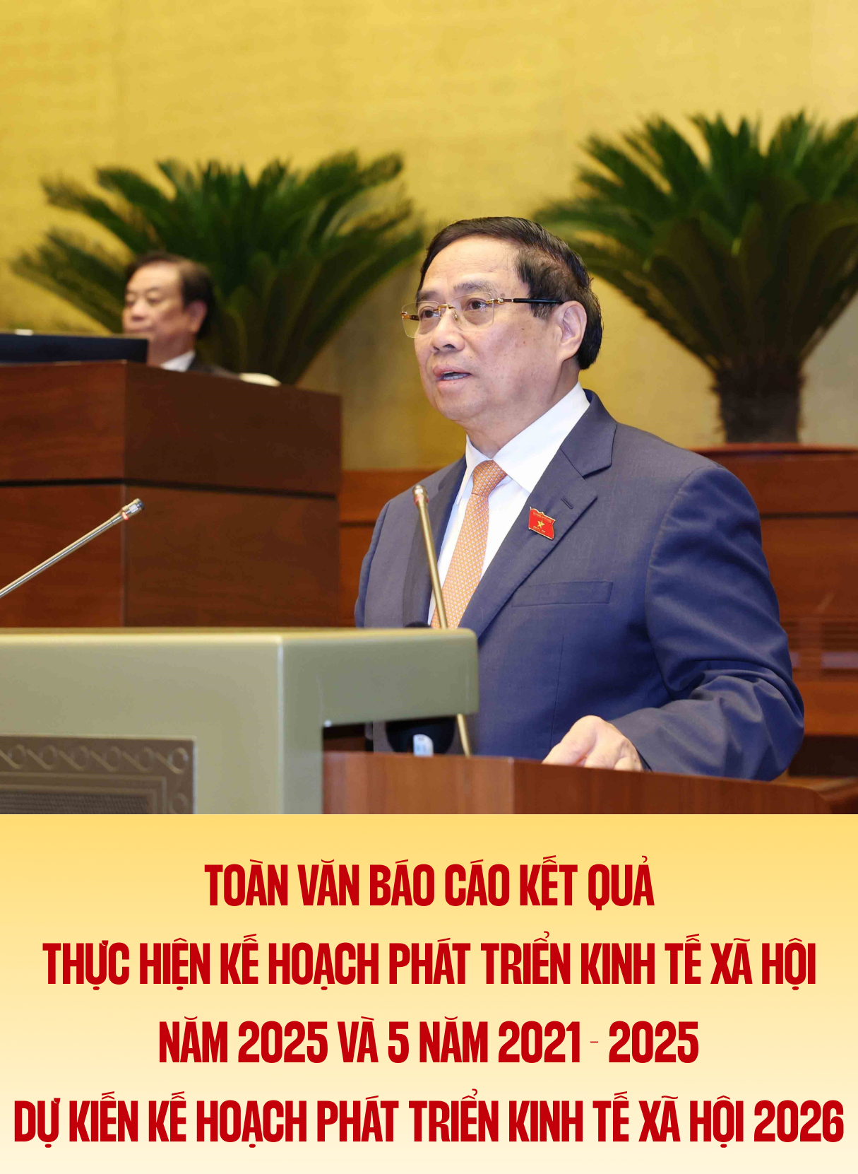 Theo chương trình Kỳ họp, Chính phủ đã gửi đến Quốc hội 120 báo cáo, tờ trình, hồ sơ, tài liệu, trong đó có Báo cáo kết quả thực hiện Kế hoạch phát triển kinh tế - xã hội (KTXH) năm 2025 và 5 năm 2021 - 2025; dự kiến kế hoạch phát triển KTXH năm 2026. Thay mặt Chính phủ, tôi xin trân trọng báo cáo Quốc hội và đồng bào, cử tri cả nước những nội dung chủ yếu như sau: