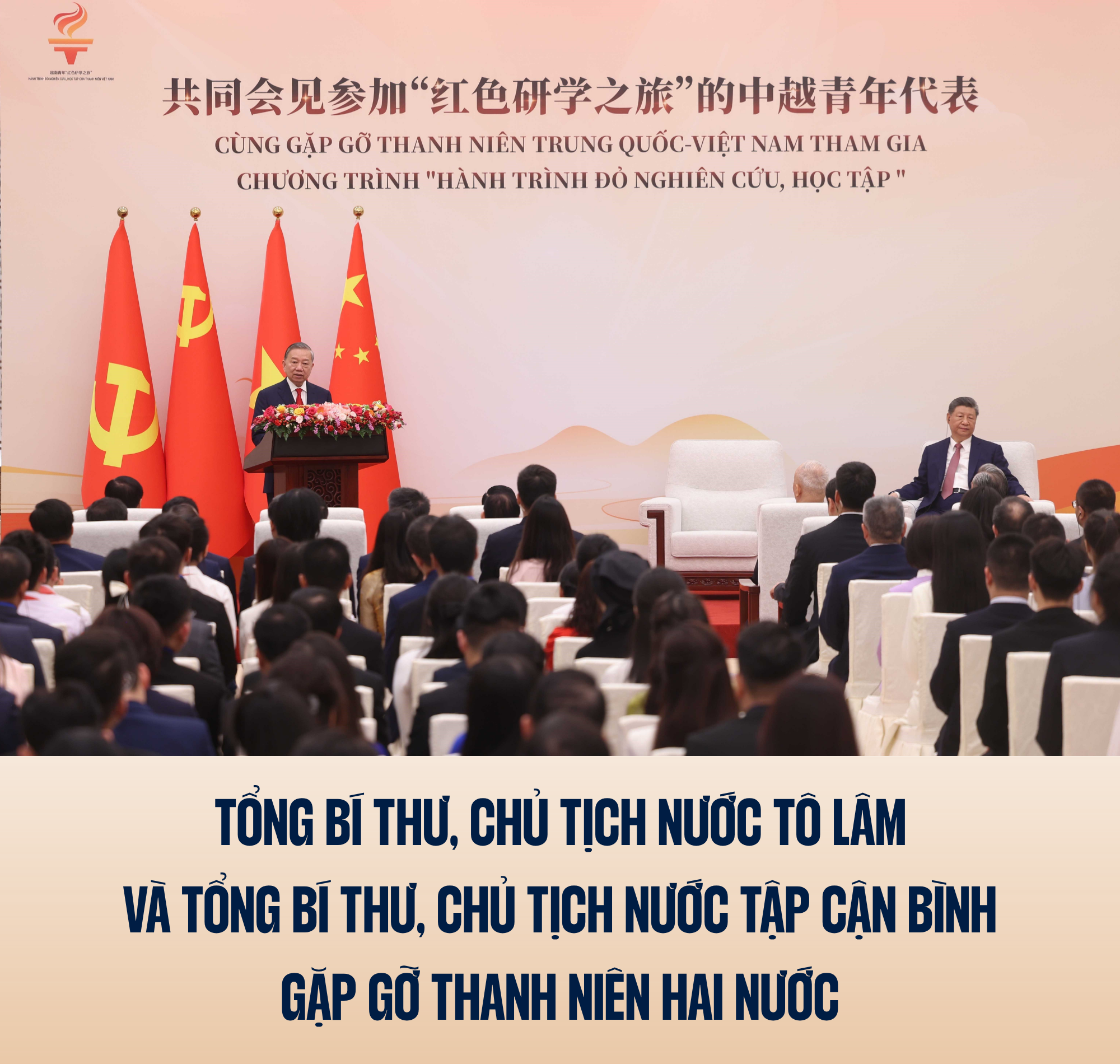 Tổng Bí thư, Chủ tịch nước Tô Lâm và Tổng Bí thư, Chủ tịch nước Tập Cận Bình tại buổi gặp gỡ thanh niên hai nước tham gia chương trình “Hành trình Đỏ nghiên cứu, học tập”. Ảnh: Thống Nhất - TTXVN