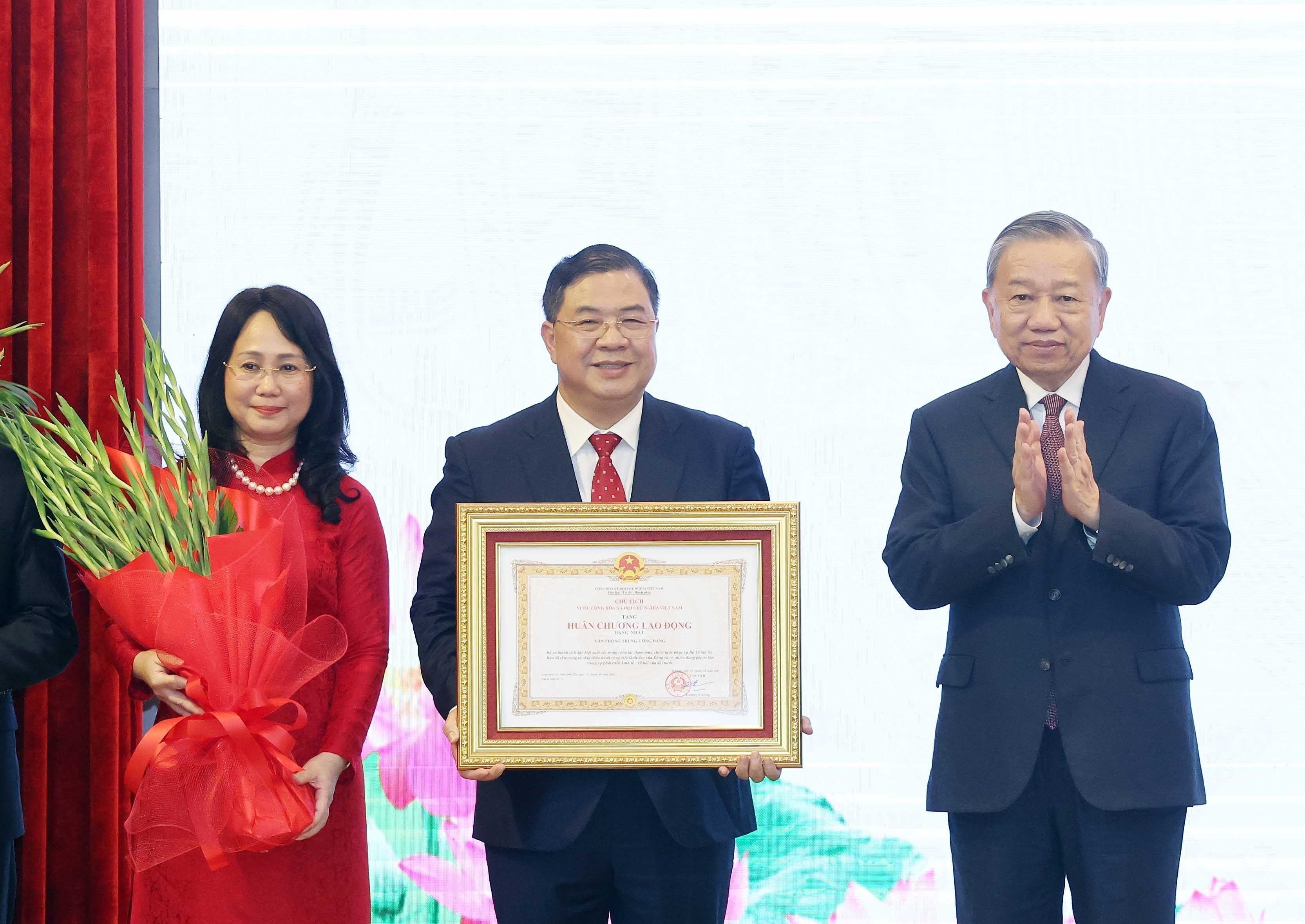 Tổng Bí thư Tô Lâm trao Huân chương Lao động hạng Nhất tặng Văn phòng Trung ương Đảng. Ảnh: Thống Nhất - TTXVN