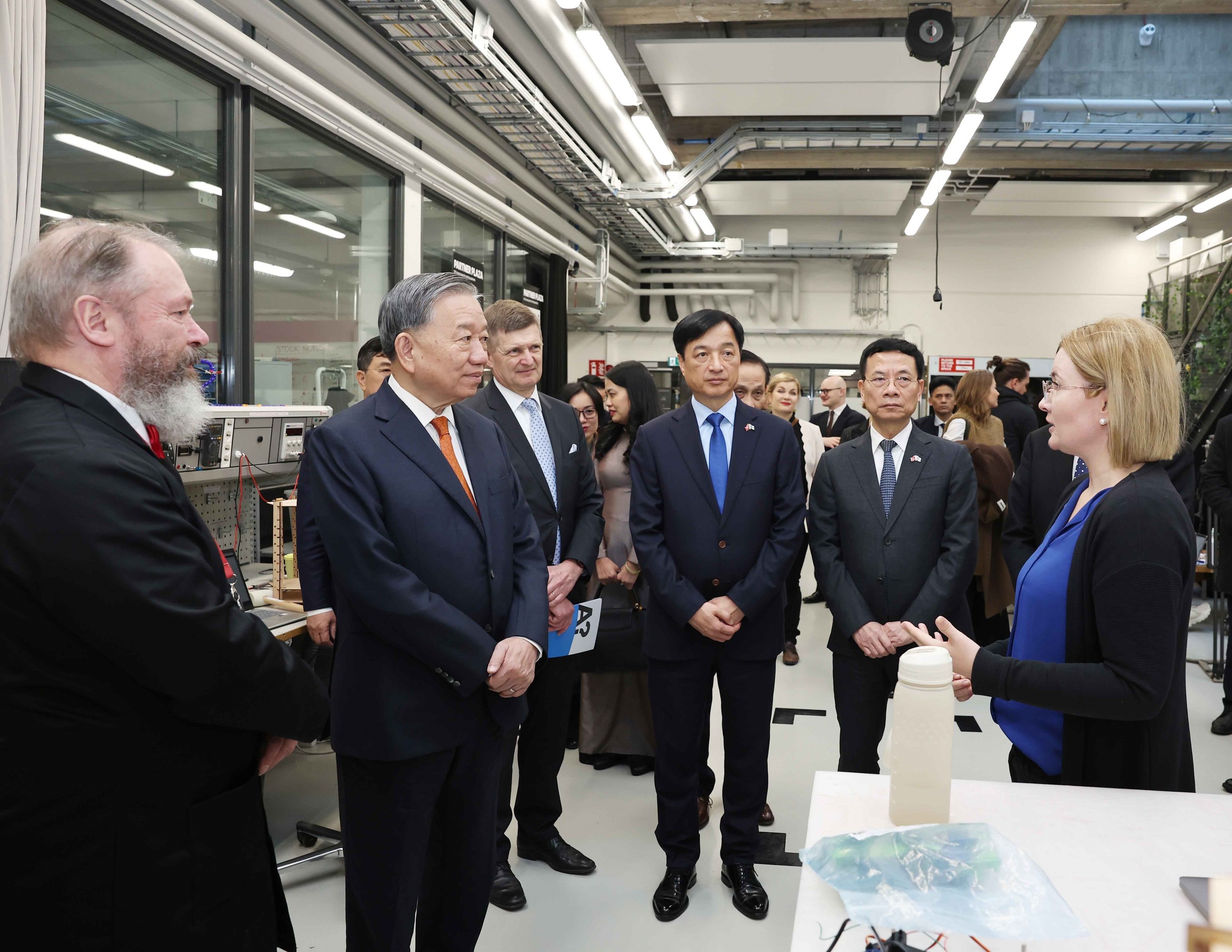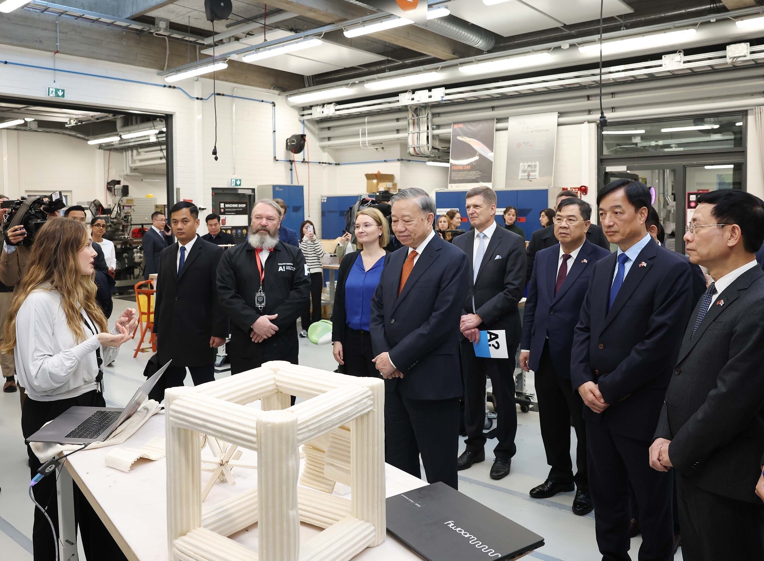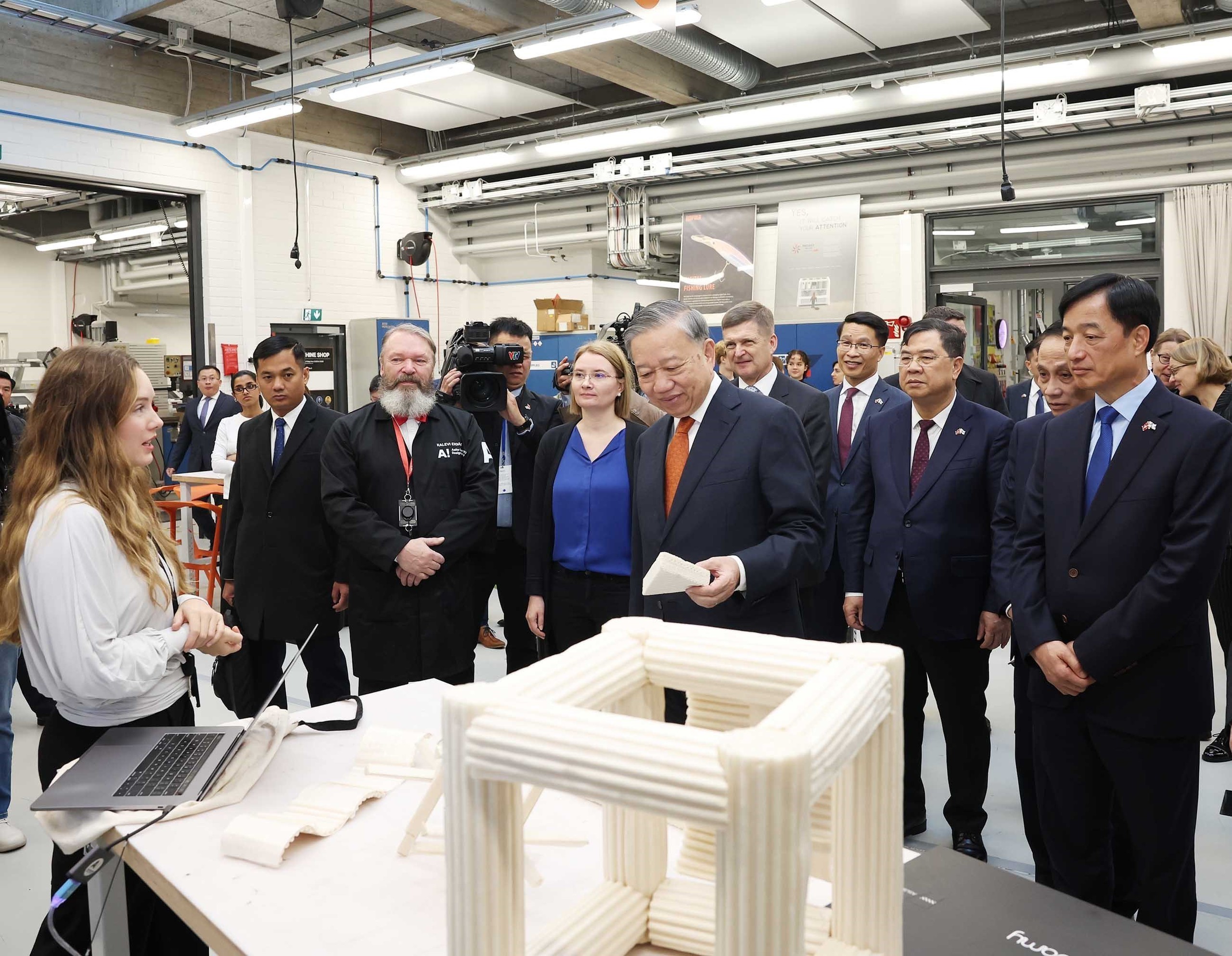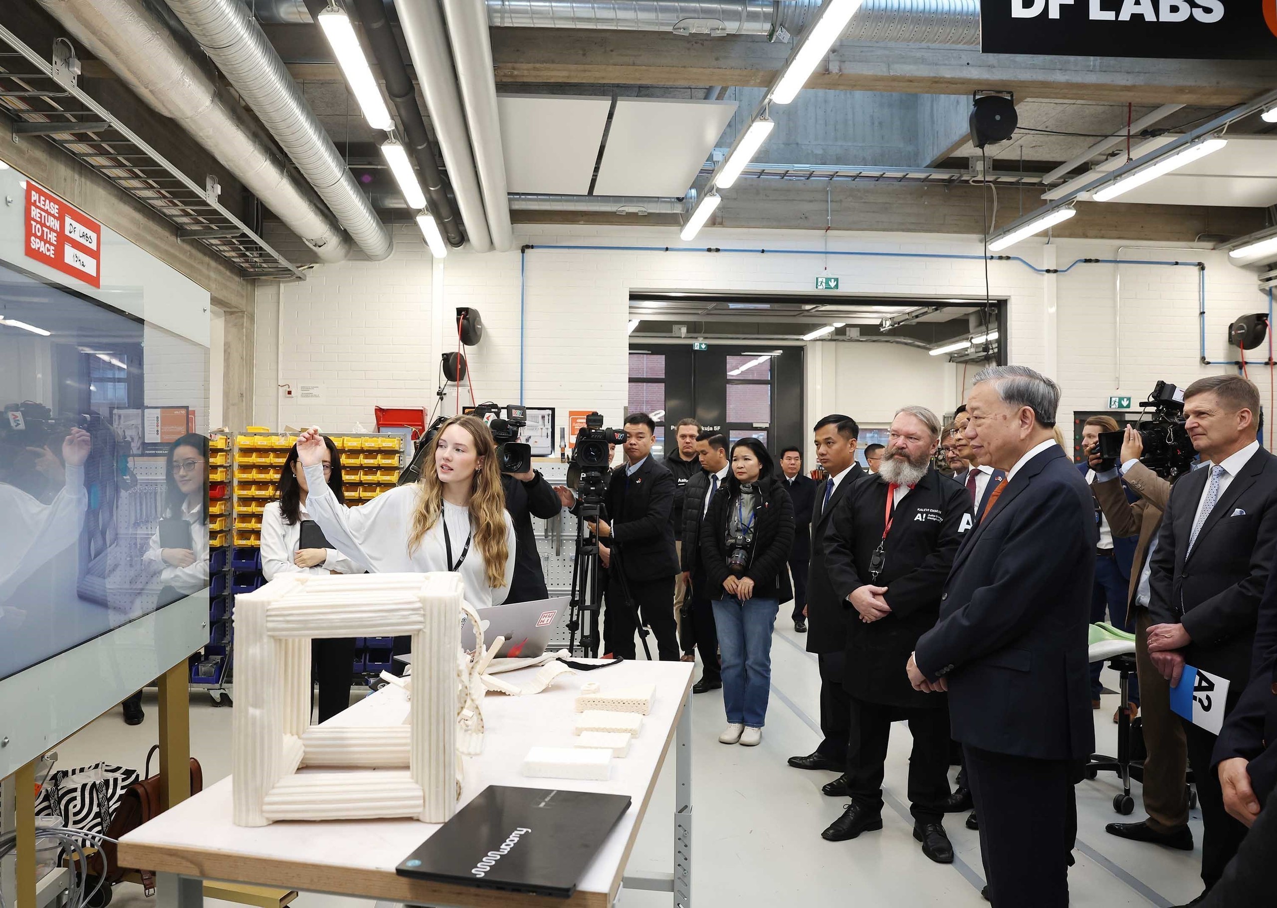 Tổng Bí thư Tô Lâm thăm phòng thí nghiệm tạo mẫu thử nghiệm tại Đại học Aalto. Ảnh: Thống Nhất – TTXVN