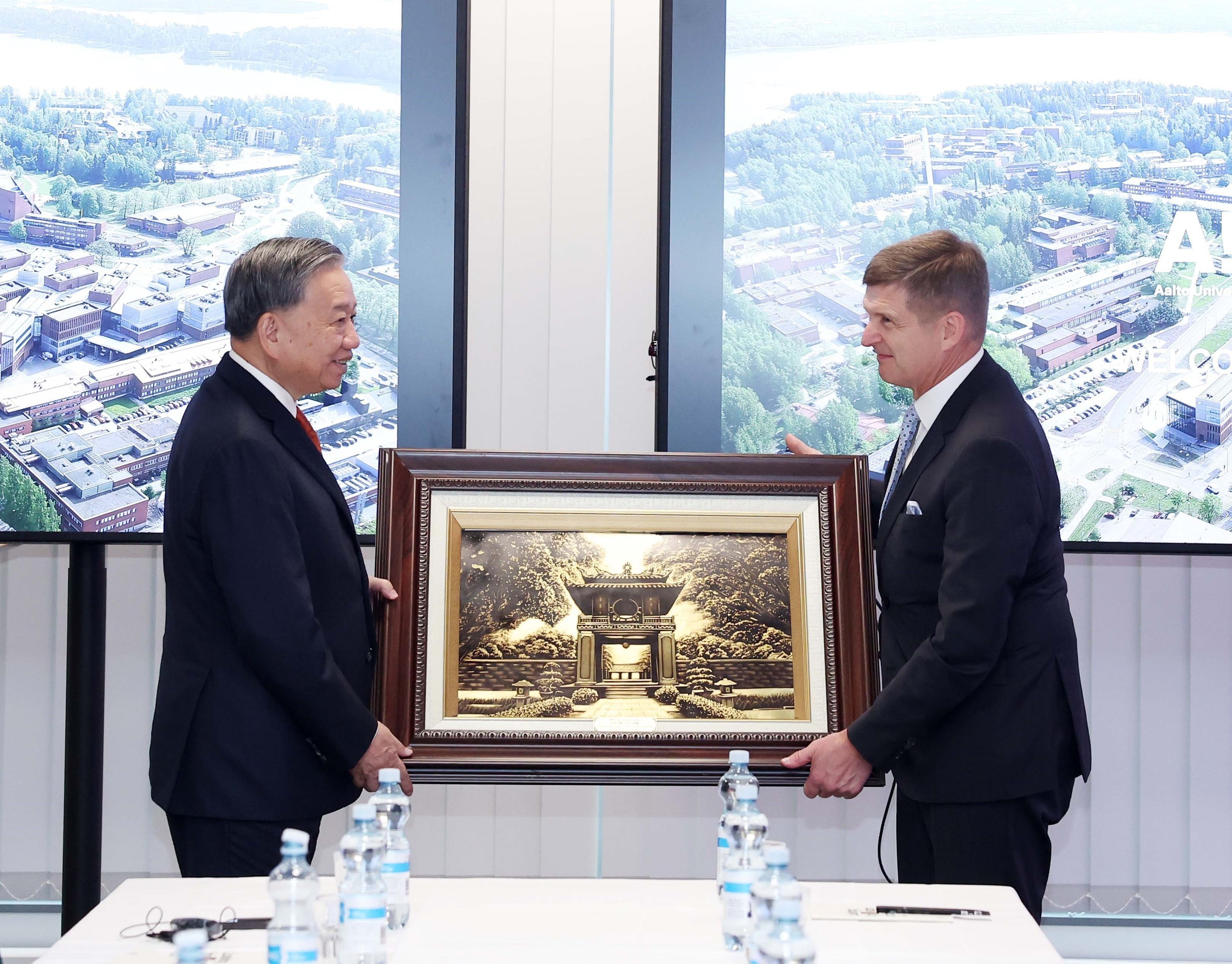 Tổng Bí thư Tô Lâm tặng quà lưu niệm cho ông Ilkka Niemela, Chủ tịch Đại học Aalto. Ảnh: Thống Nhất – TTXVN