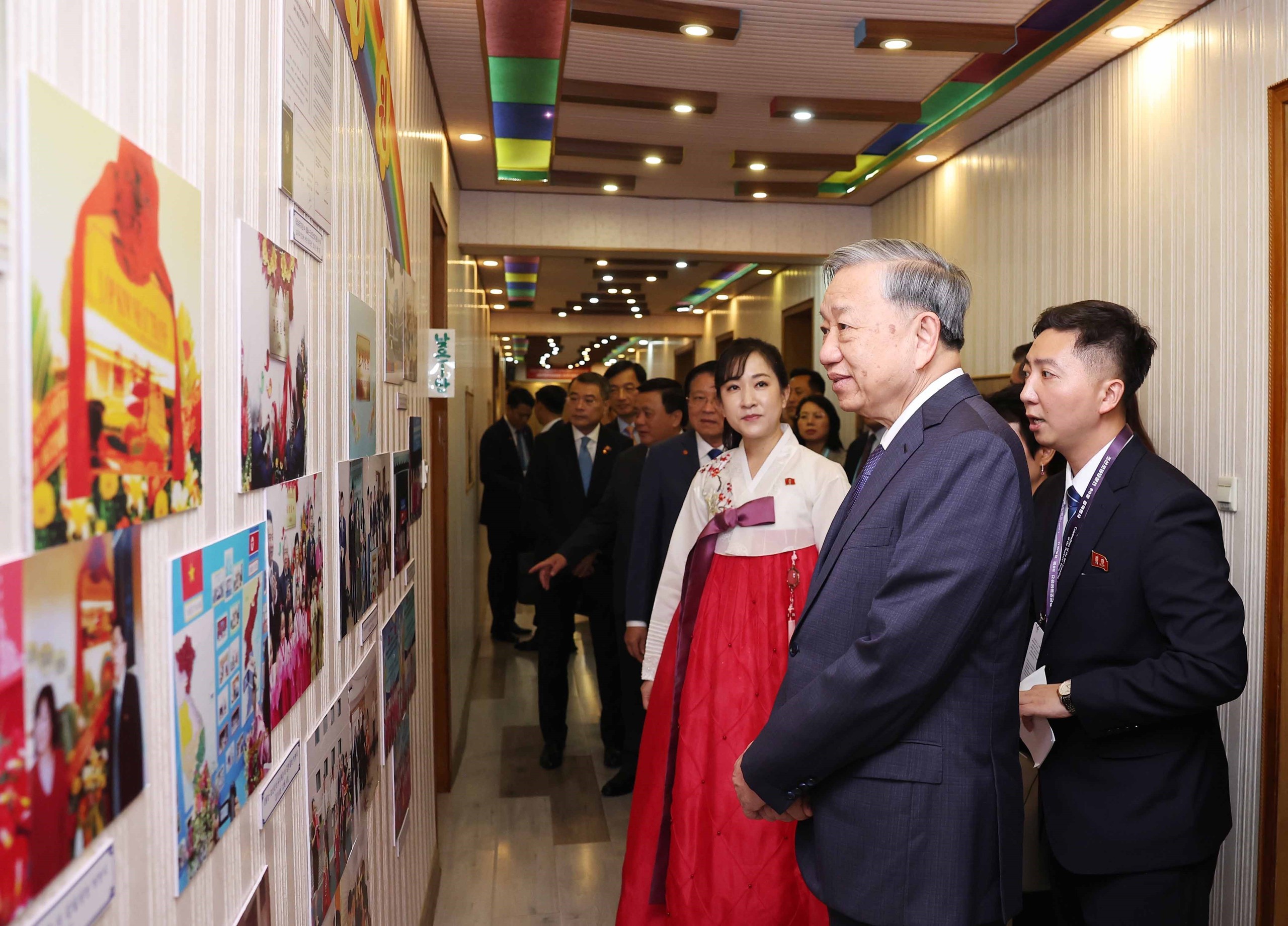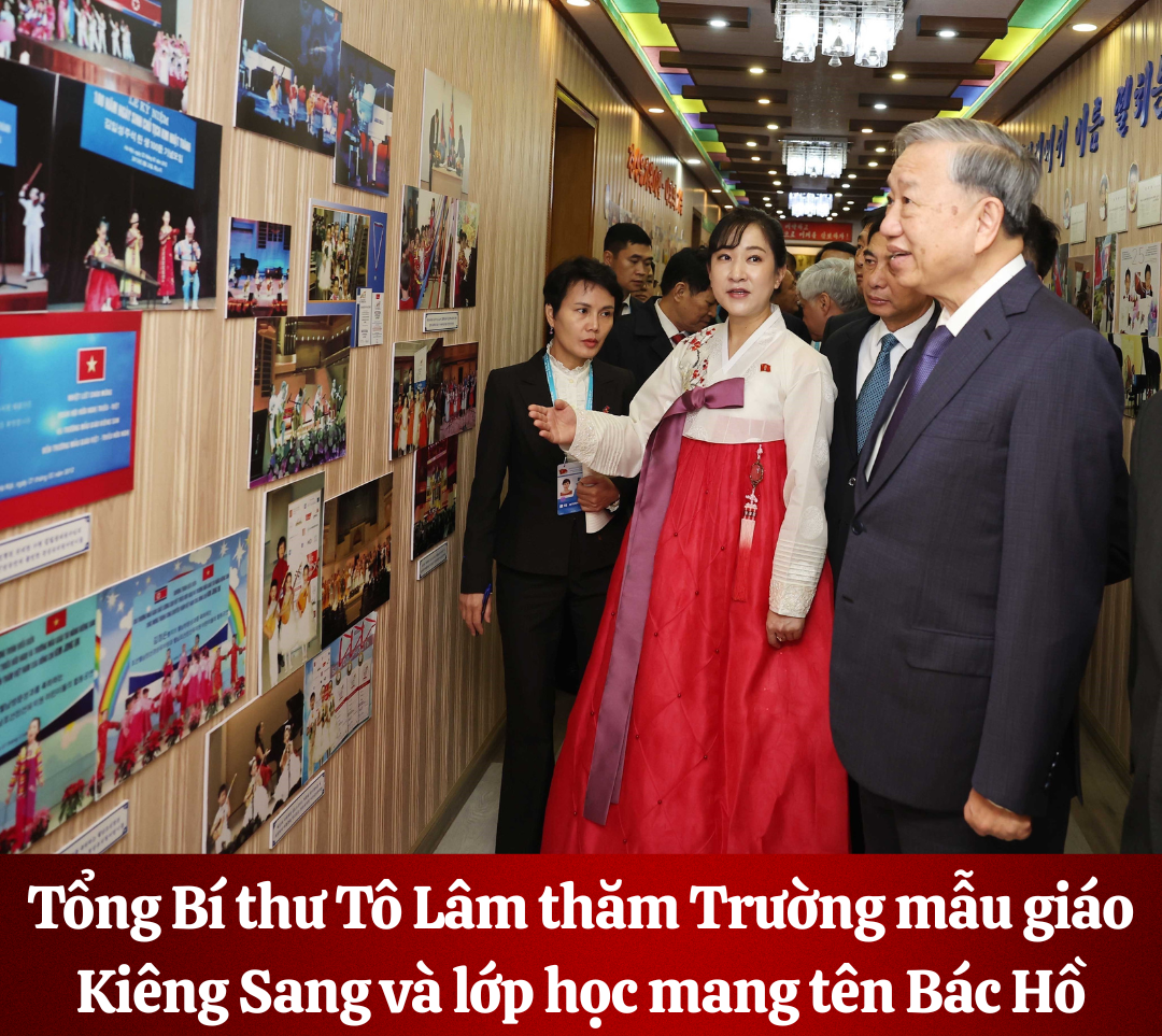 Tiếp tục chương trình thăm cấp Nhà nước tới Triều Tiên, chiều 9/10/2025, tại Thủ đô Bình Nhưỡng, Tổng Bí thư Tô Lâm tới thăm Trường mẫu giáo Kiêng Sang và lớp học mang tên Chủ tịch Hồ Chí Minh.