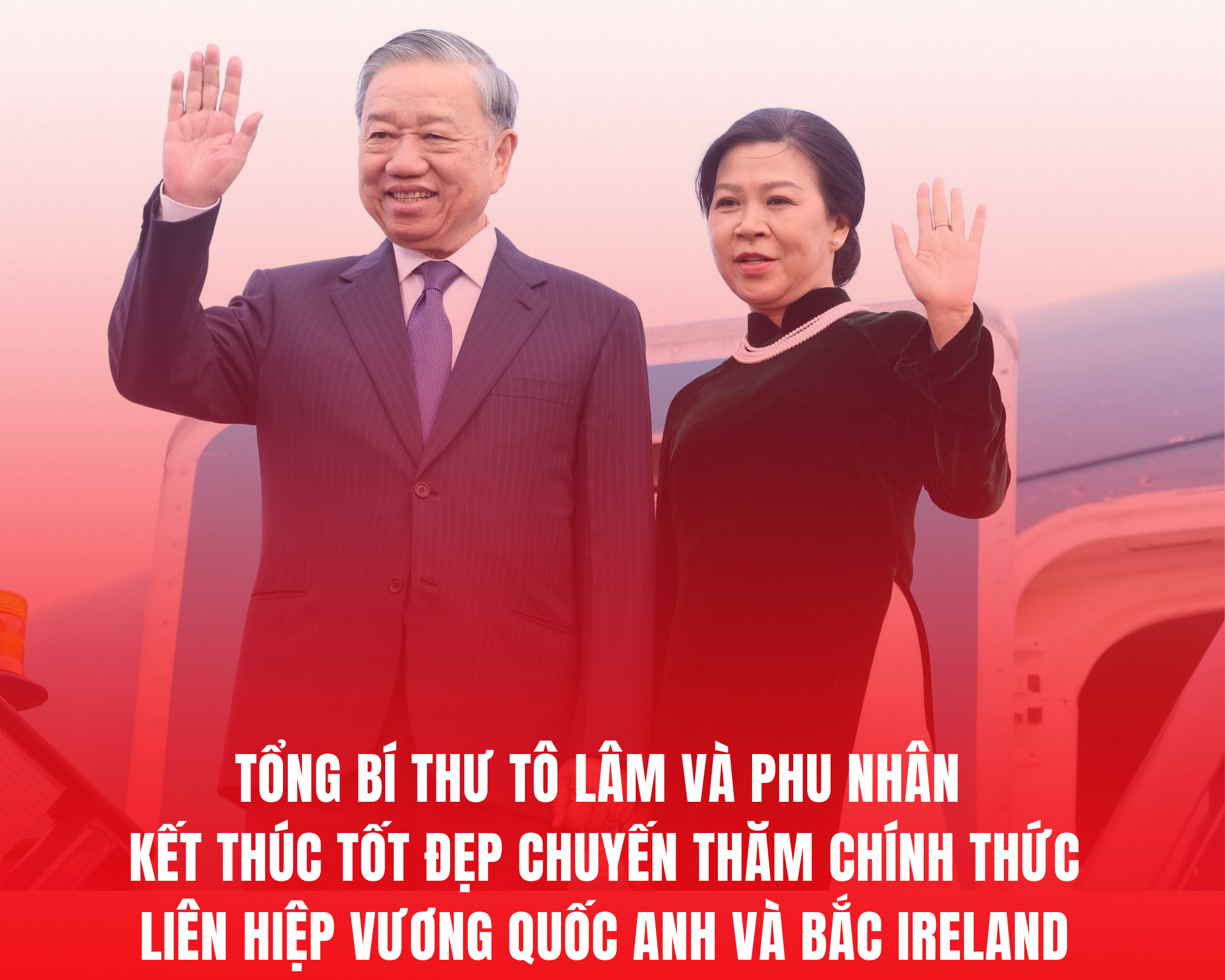 Trưa 30/10 theo giờ địa phương tại Anh, chuyên cơ chở Tổng Bí thư Tô Lâm và Phu nhân cùng Đoàn đại biểu cấp cao Việt Nam đã rời sân bay London Stansted ở thủ đô London, kết thúc tốt đẹp chuyến thăm chính thức Liên hiệp Vương quốc Anh và Bắc Ireland theo lời mời của Thủ tướng Liên hiệp Vương quốc Anh và Bắc Ireland Keir Starmer từ ngày 28 - 30/10/2025.