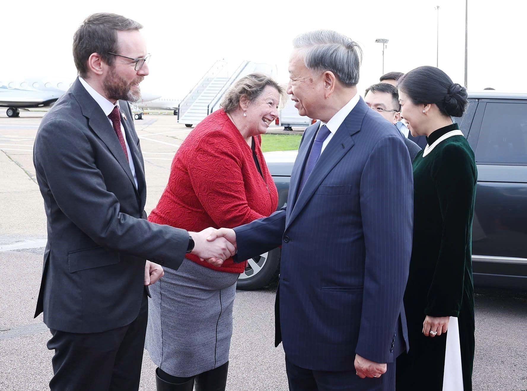 Tiễn Tổng Bí thư Tô Lâm và Phu nhân cùng Đoàn đại biểu cấp cao Việt Nam tại sân bay, về phía Liên hiệp Vương quốc Anh và Bắc Ireland có Thứ trưởng Bộ Ngoại giao Seema Malhotra; Đại sứ Liên hiệp Vương quốc Anh và Bắc Ireland tại Việt Nam Iain Frew; đại diện Vụ Lễ tân Bộ Ngoại giao Stephen Walton. Về phía Việt Nam có Đại sứ Việt Nam tại Liên hiệp Vương quốc Anh và Bắc Ireland Đỗ Minh Hùng và Phu nhân; cán bộ, nhân viên Đại sứ quán Việt Nam tại Liên hiệp Vương quốc Anh và Bắc Ireland.