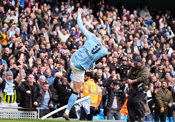 Bước ngoặt đến ở phút 37 khi Man City được hưởng penalty sau pha phạm lỗi của Van Dijk với O'Reilly. Trên chấm 11m, Erling Haaland mở tỷ số ở phút 39. Trước khi hiệp 1 khép lại, Haaland tiếp tục lập công với cú đánh đầu ở phút 45+2, giúp Man City dẫn 2-0.