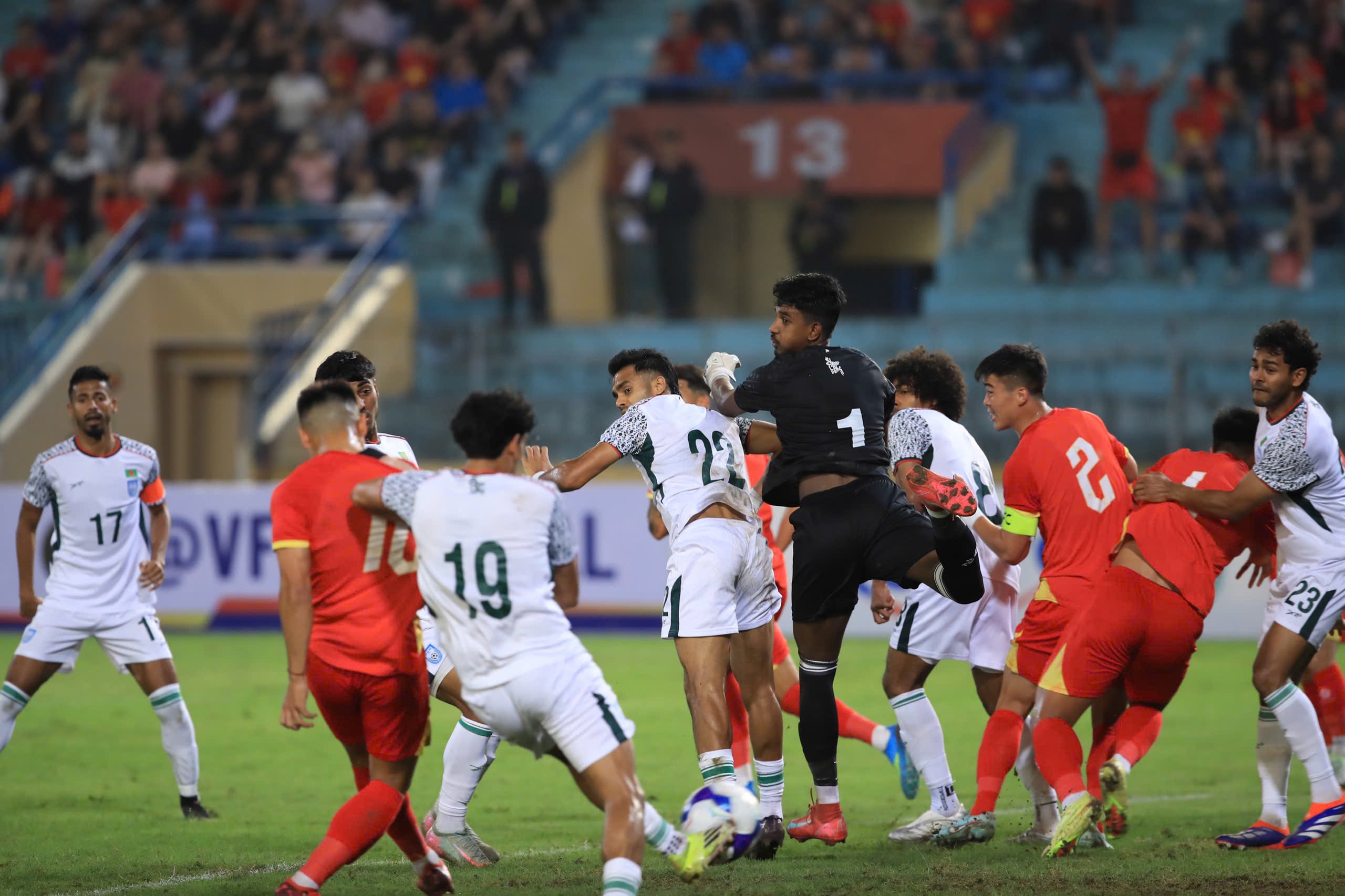 27': KHÔNG VÀO! ĐT Bangladesh có tình huống dứt điểm tuyến 2 nhưng bóng đi vọt xà ngang khung thành của ĐT Việt Nam.